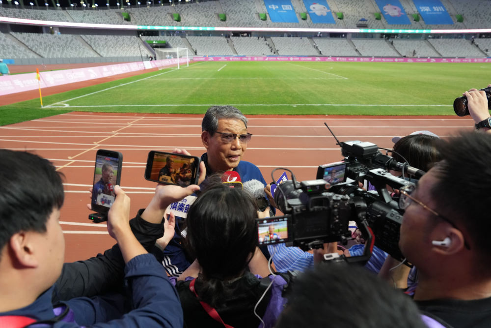 11月12日,上海队总教练徐根宝(中)在赛后接受采访。当日,在深圳进行的第十五届全国运动会足球项目男子20岁以下组铜牌赛中,上海队通过点球大战5比4战胜山东队,获得铜牌。新华社记者 丁增尼达 摄