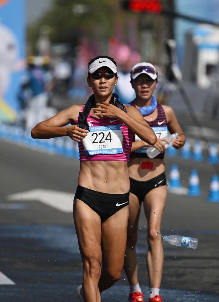 11月12日,第十五届全国运动会田径项目女子20公里竞走决赛在广东珠海举行,广东队选手刘虹(左)在比赛中。新华社记者 连振 摄