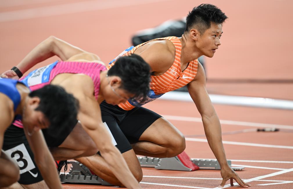 2025年11月17日,第十五届全国运动会田径男子100米复赛,浙江队选手谢震业(右)准备起跑。最终,他无缘决赛。新华社记者 肖艺九 摄