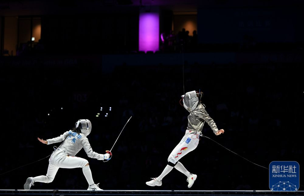 ↑广东队选手郑燕华(左)与江苏队选手杨恒郁在比赛中。 新华社记者 胡虎虎 摄