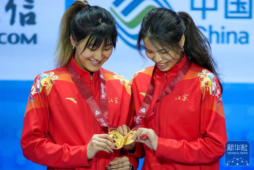 ↑在颁奖仪式上,江苏队选手庄晨艺(左)和队友杨恒郁手持金牌互动。 新华社记者 吴鲁 摄