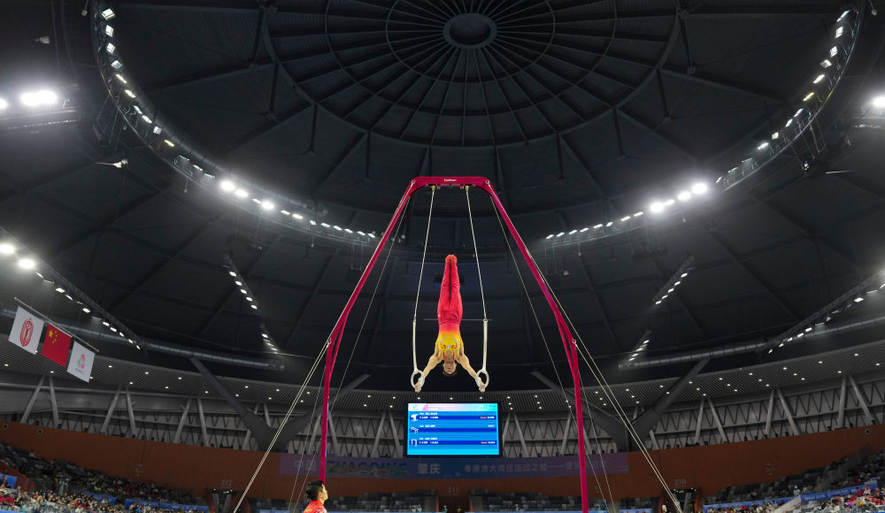 11月12日,江苏队选手孙炜在吊环比赛中。新华社记者 胥冰洁 摄