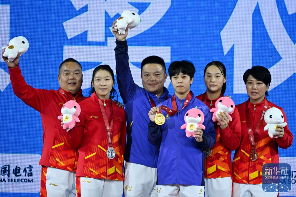 ↑获得冠军的福建队选手魏婷娜(右三)、获得亚军的重庆队选手苏婷婷(左二)、获得季军的重庆队选手刘梦佳(右二)在颁奖仪式上与教练合影。