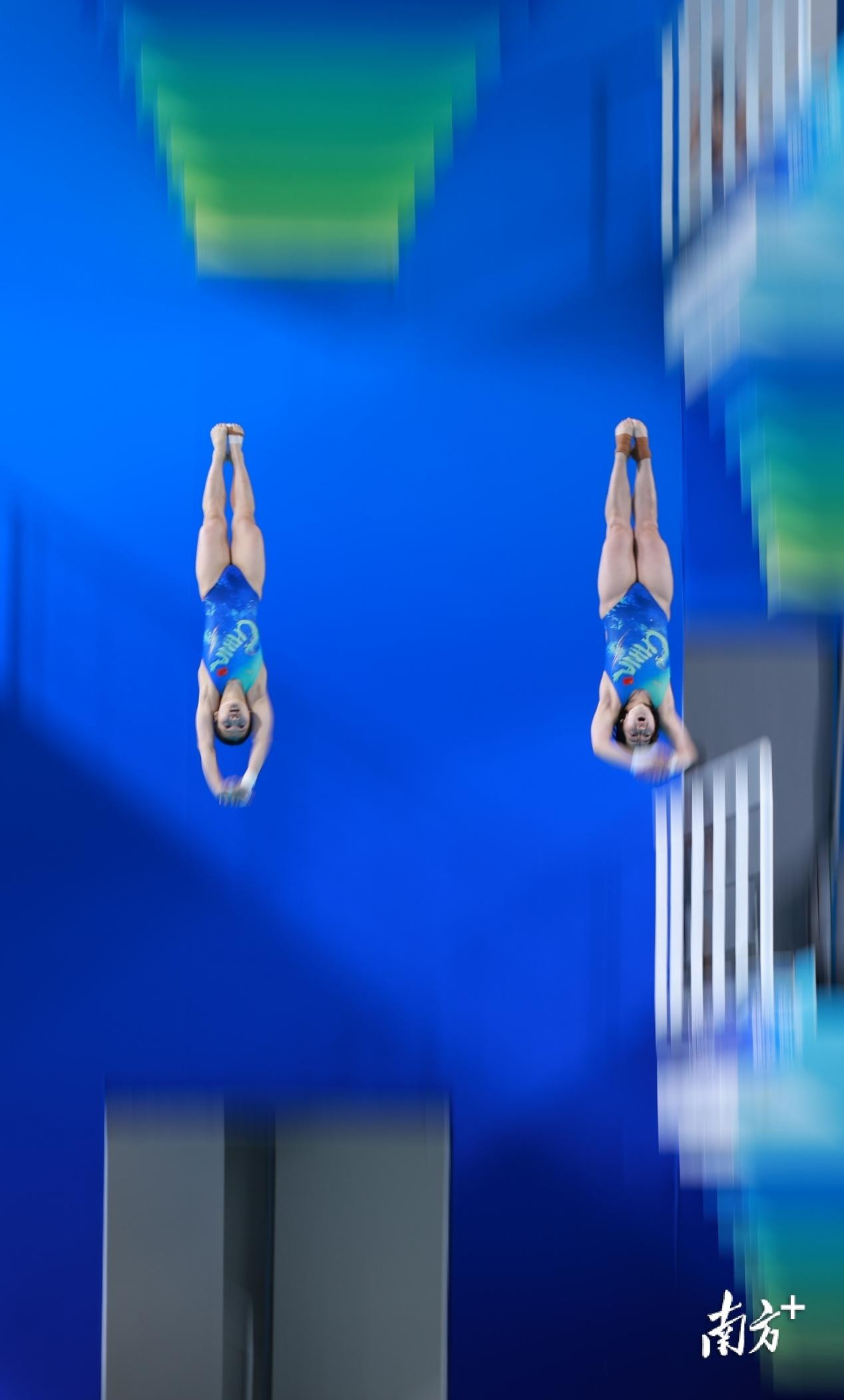 11月6日晚,十五运会女子双人10米跳台决赛,广东组合全红婵、王伟莹在比赛中。南方+记者 张令 吴明 摄