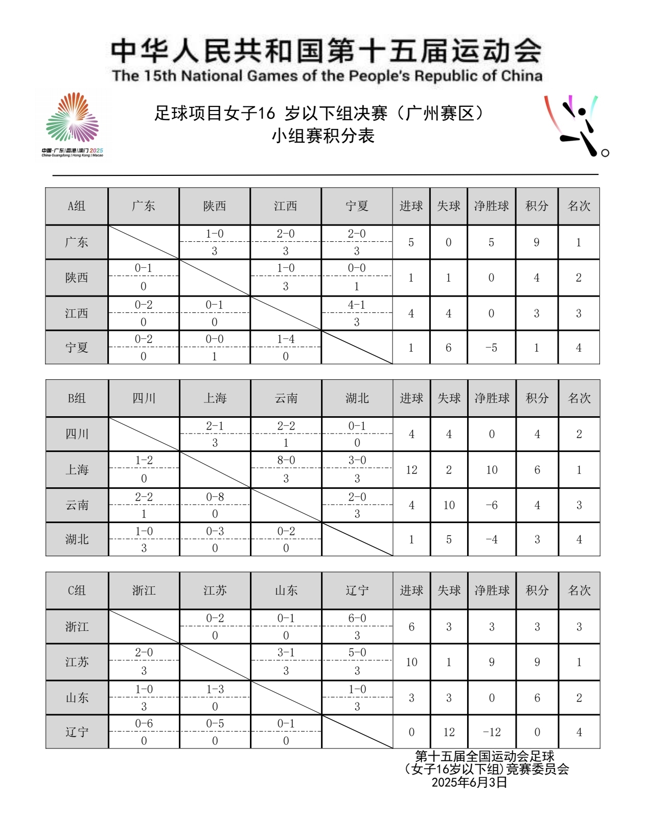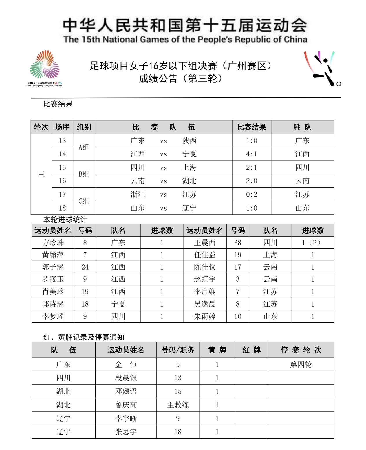 全运会女足U16决赛阶段成绩公告(第三轮)