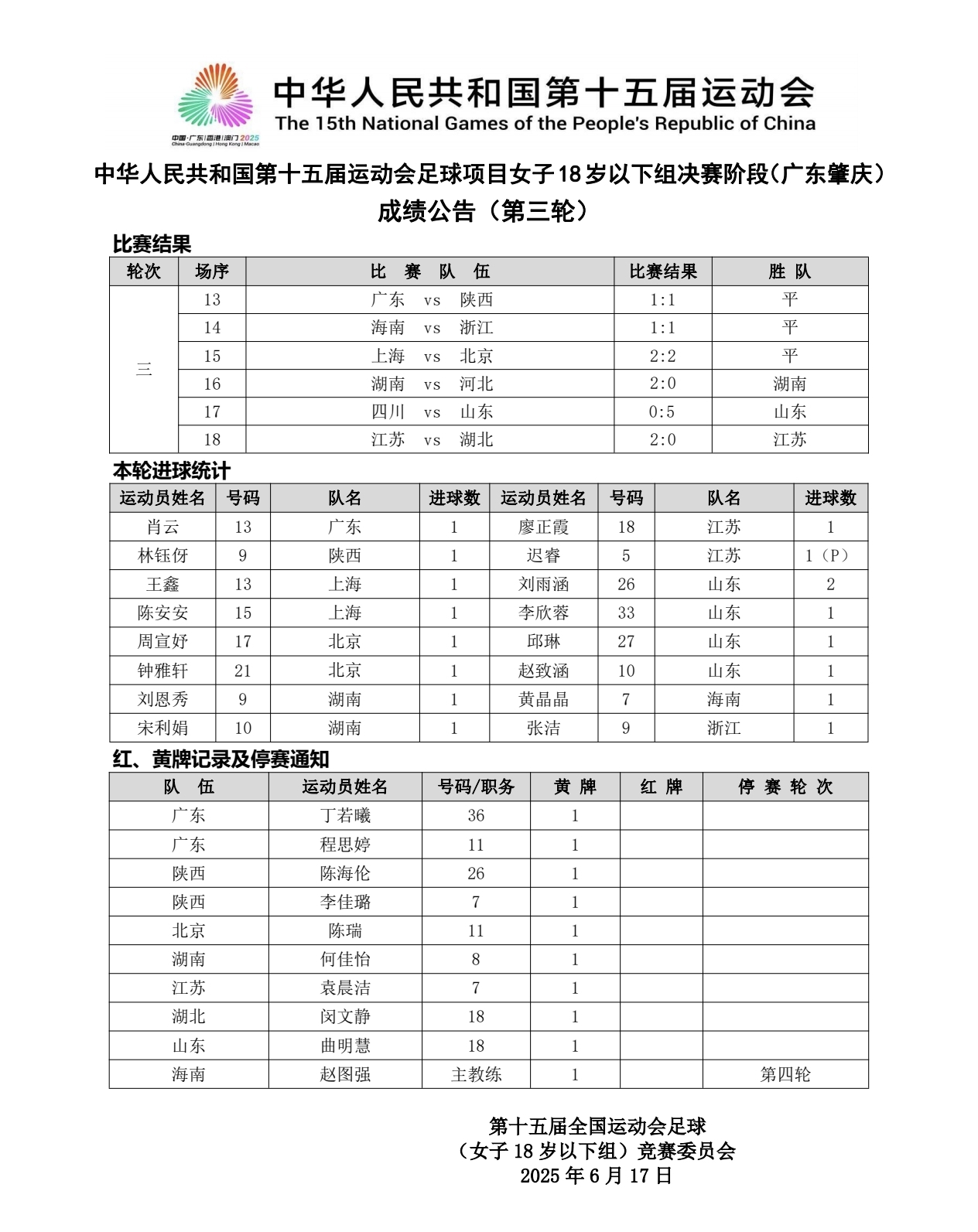 全运会女足U18决赛阶段成绩公告(第三轮)
