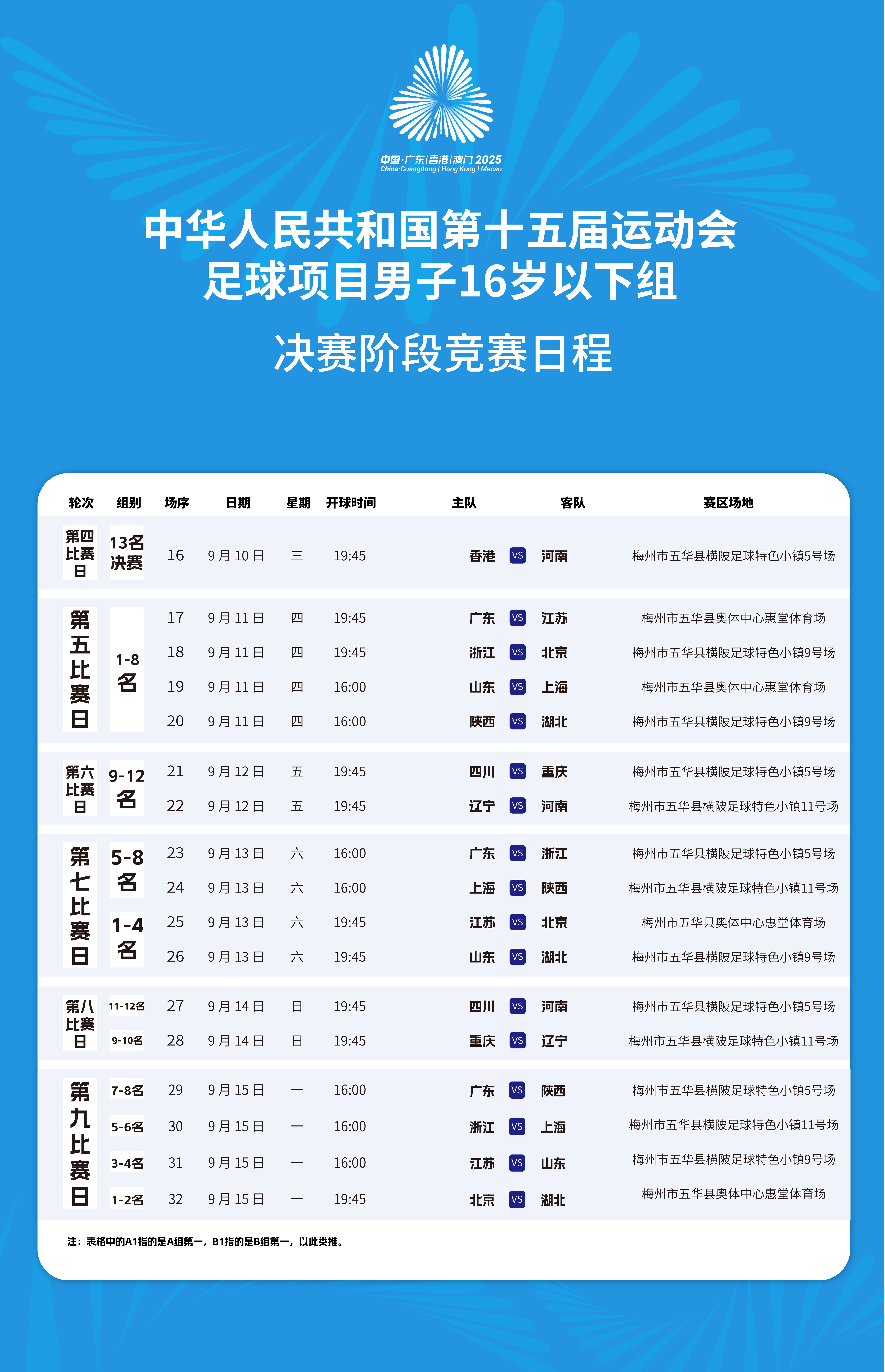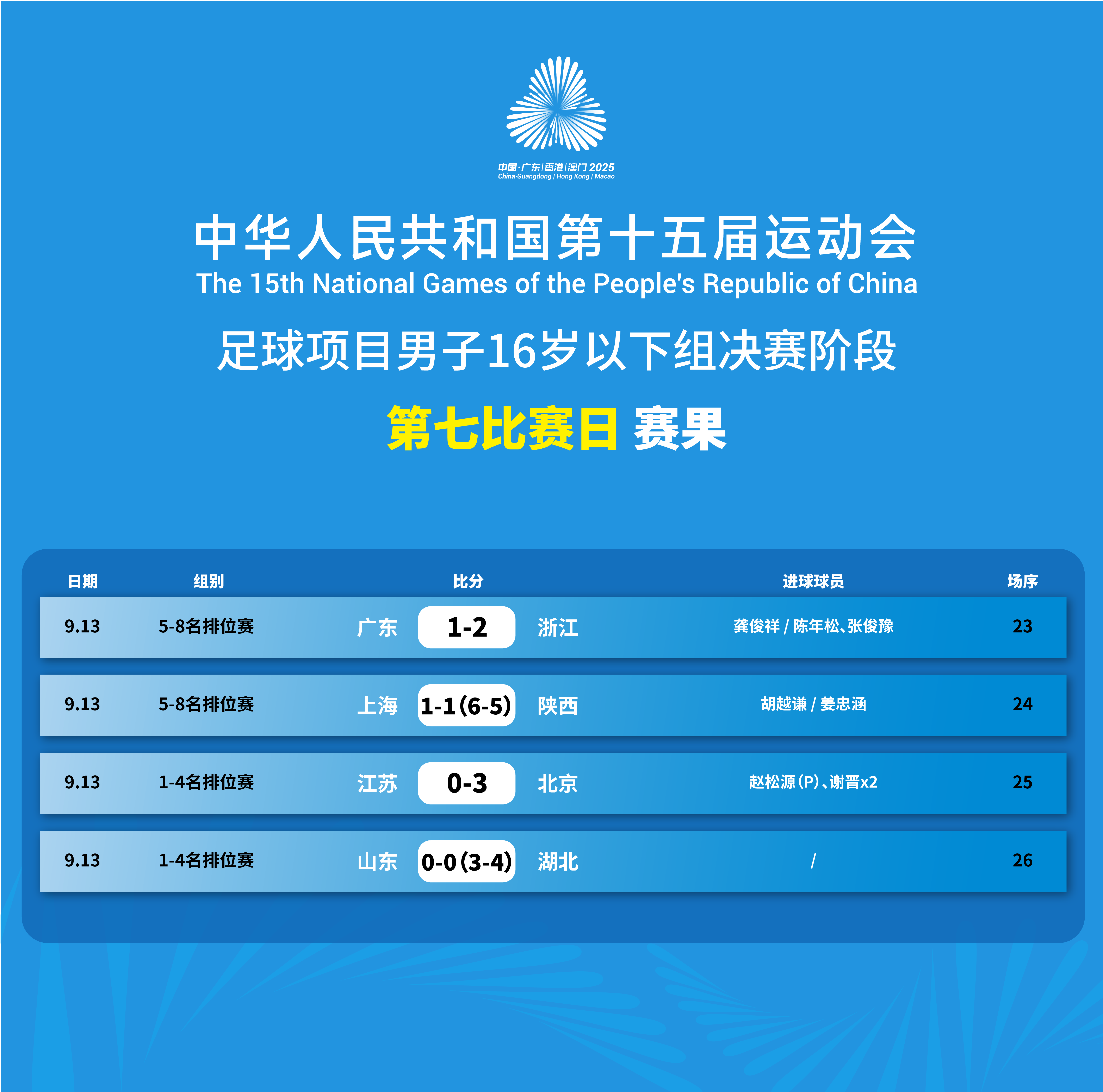 【赛事成绩】第十五届全国运动会男足16岁以下组(9月13日)