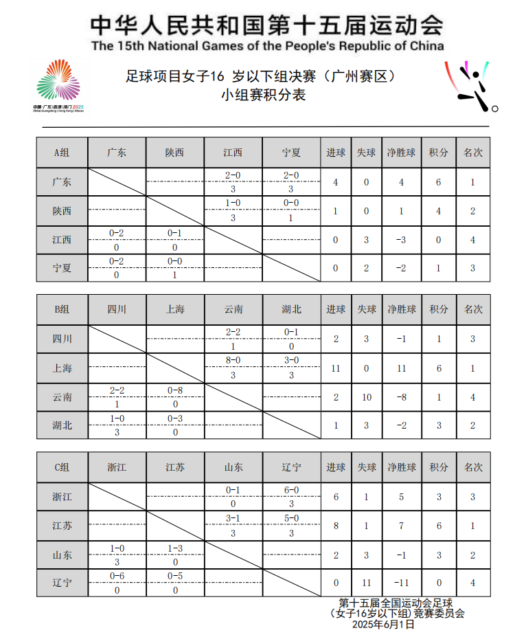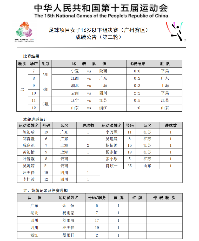 全运会女足U16决赛阶段成绩公告(第二轮)