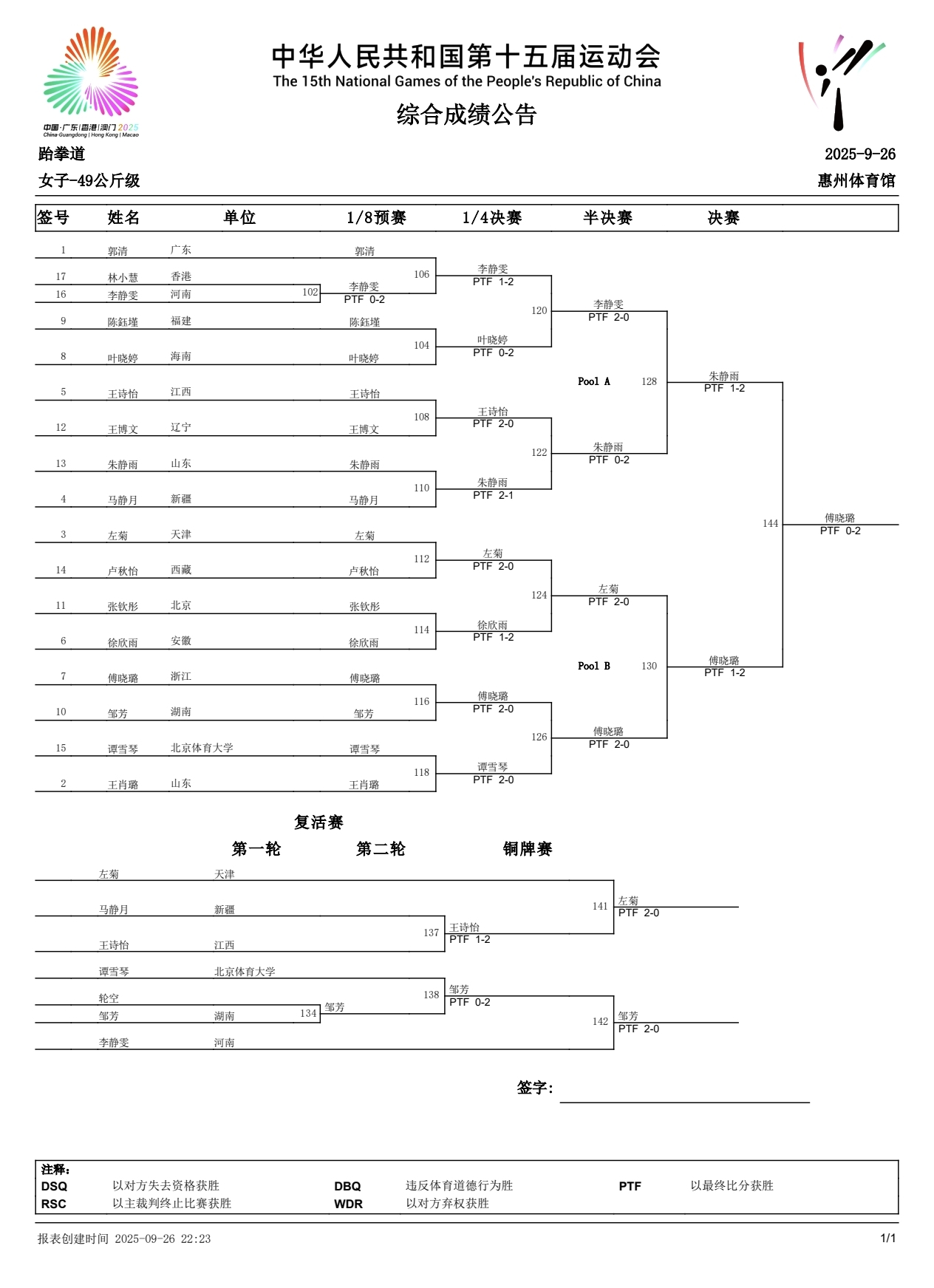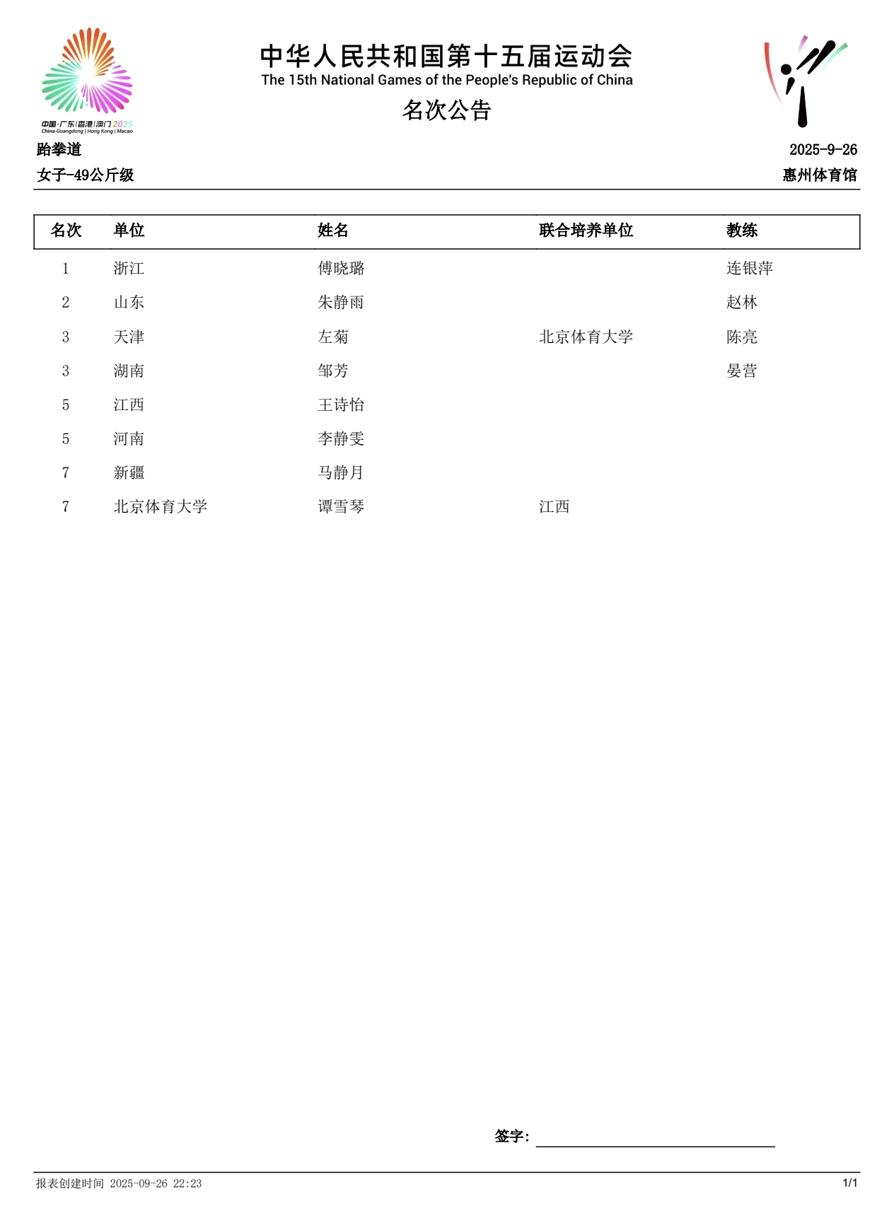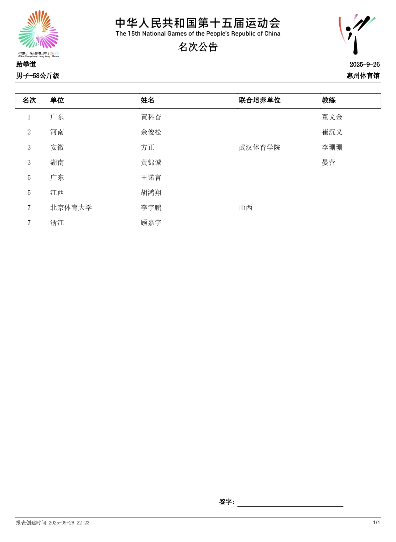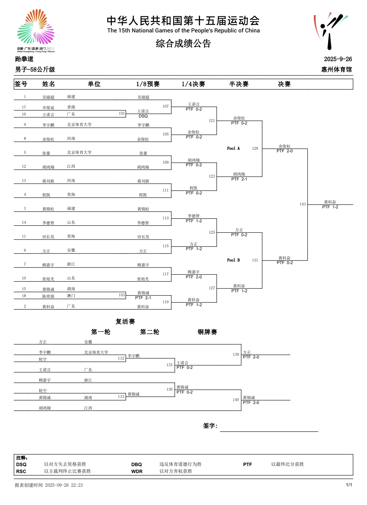 第十五届全国运动会跆拳道成绩公告(9月26日)