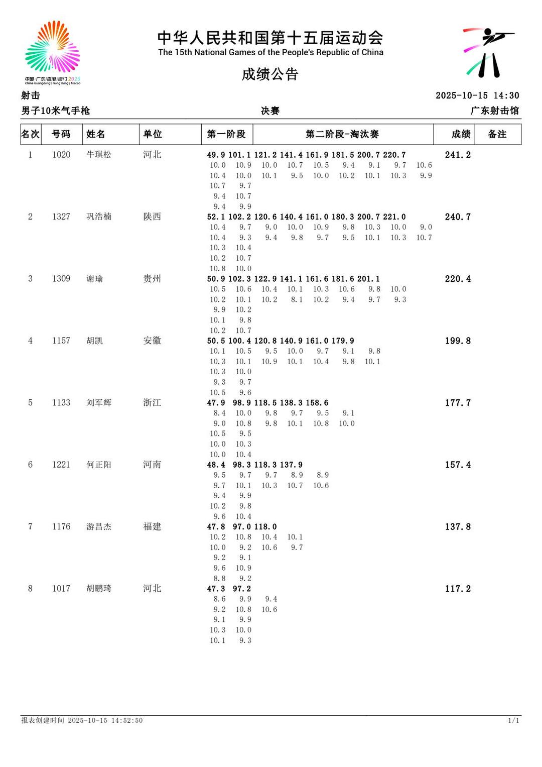 【赛事成绩】第十五届全国运动会射击男子10米气手枪决赛成绩公告(10月15日)