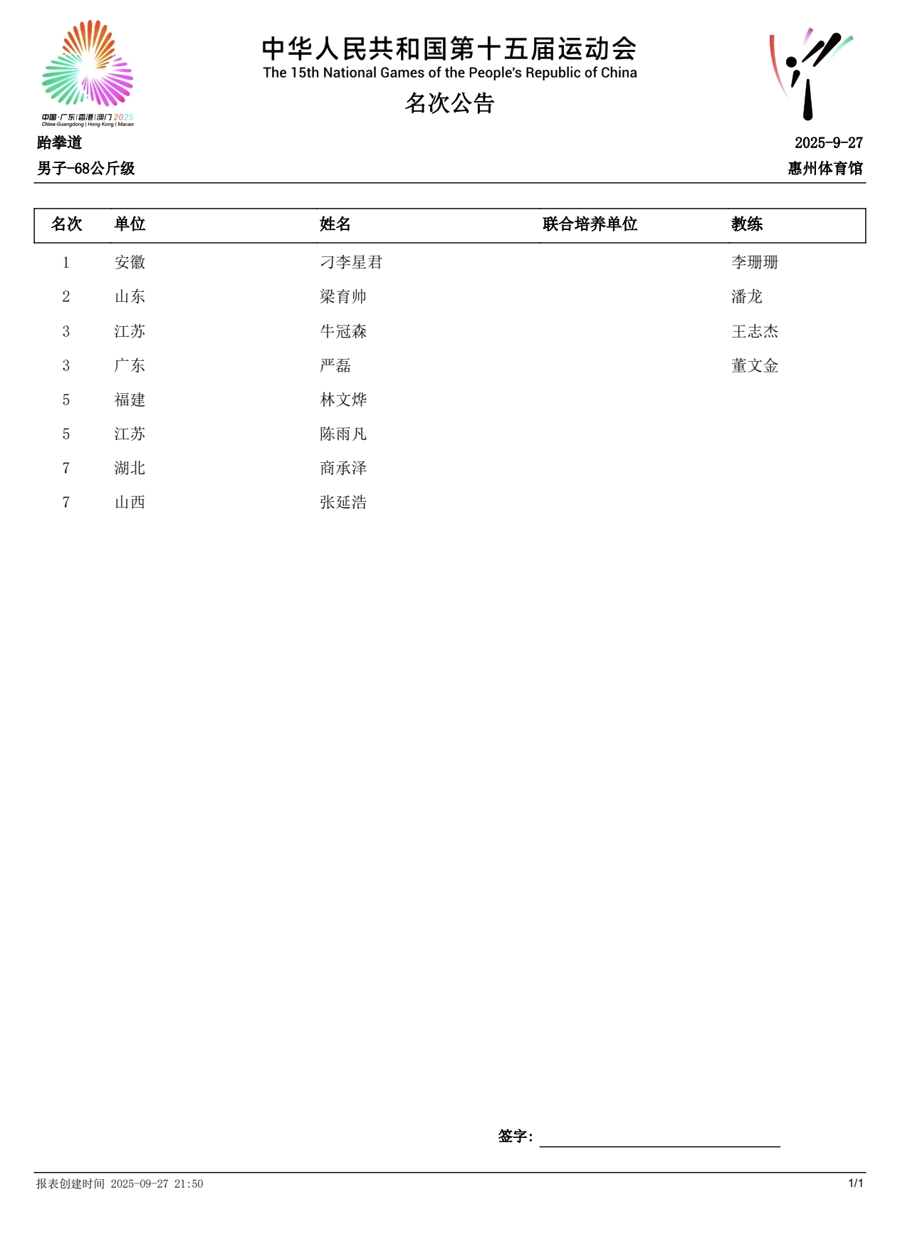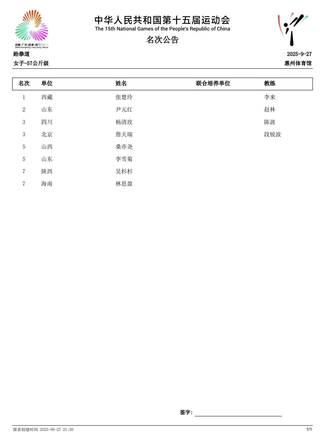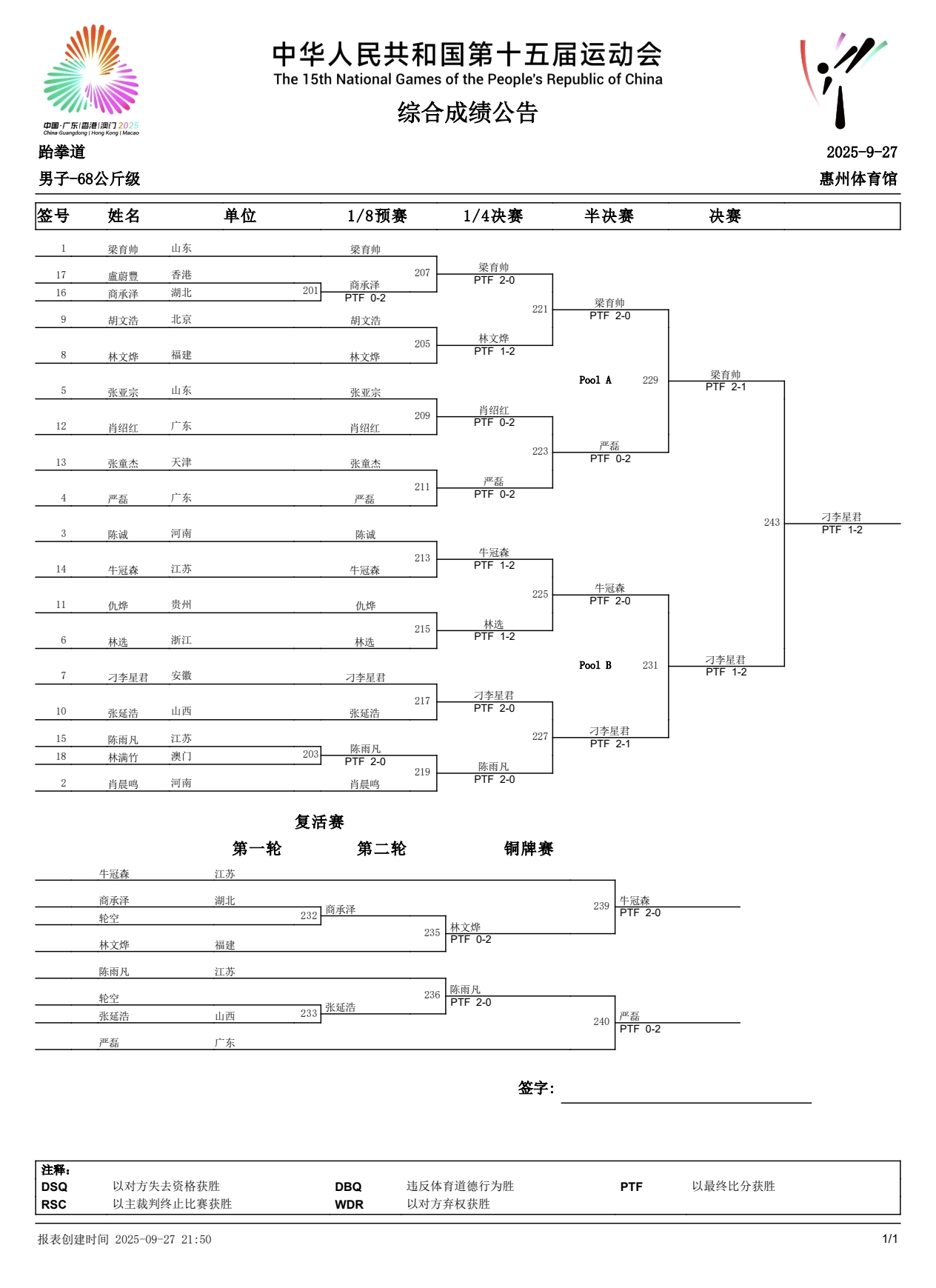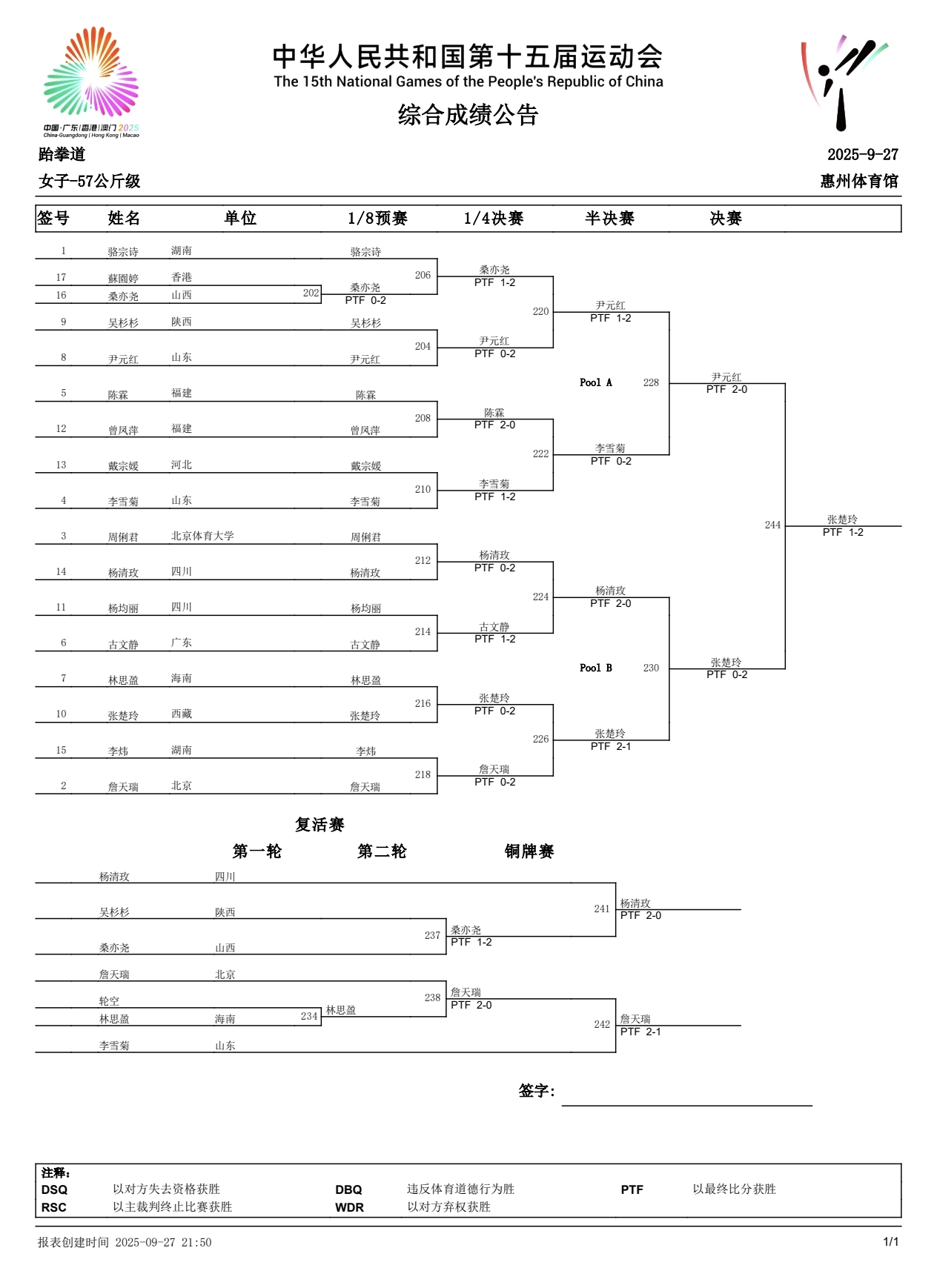 第十五届全国运动会跆拳道成绩公告(9月27日)