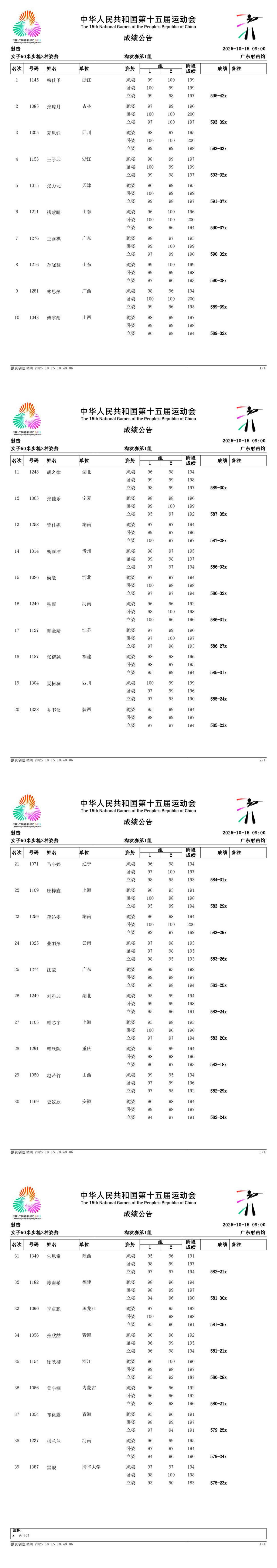 【赛事成绩】第十五届全国运动会射击女子50米步枪3种姿势淘汰赛第1组成绩公告(10月15日)
