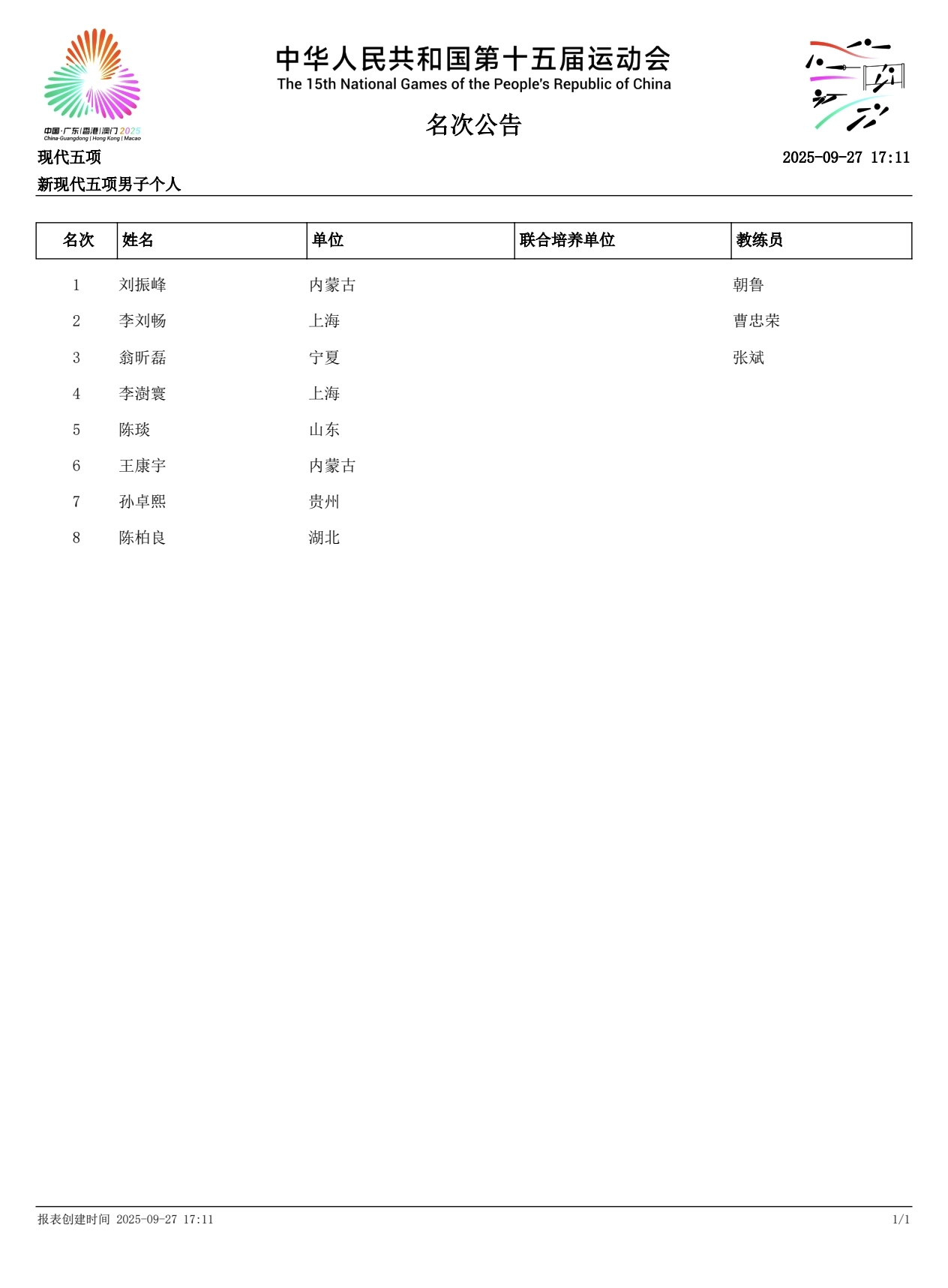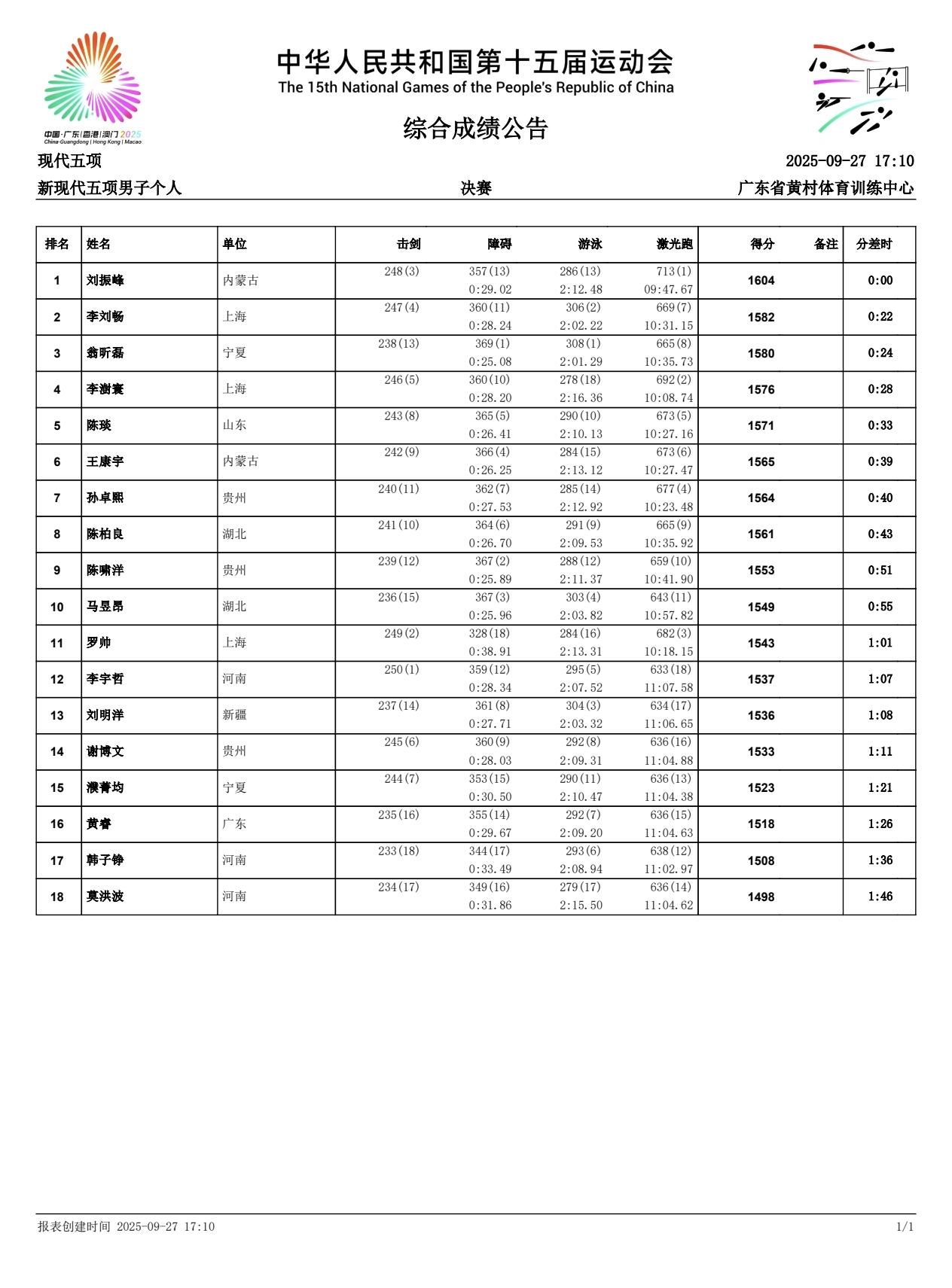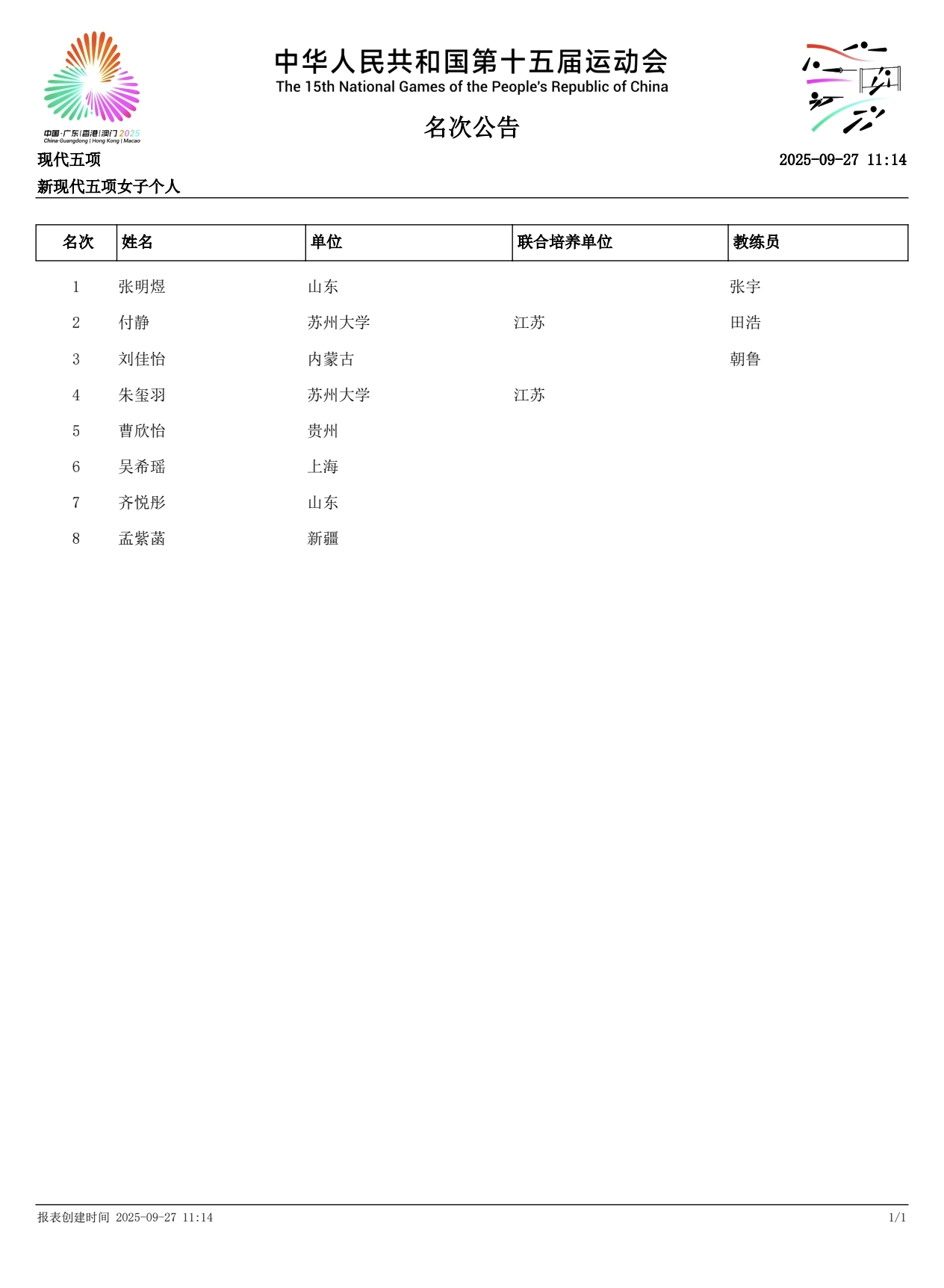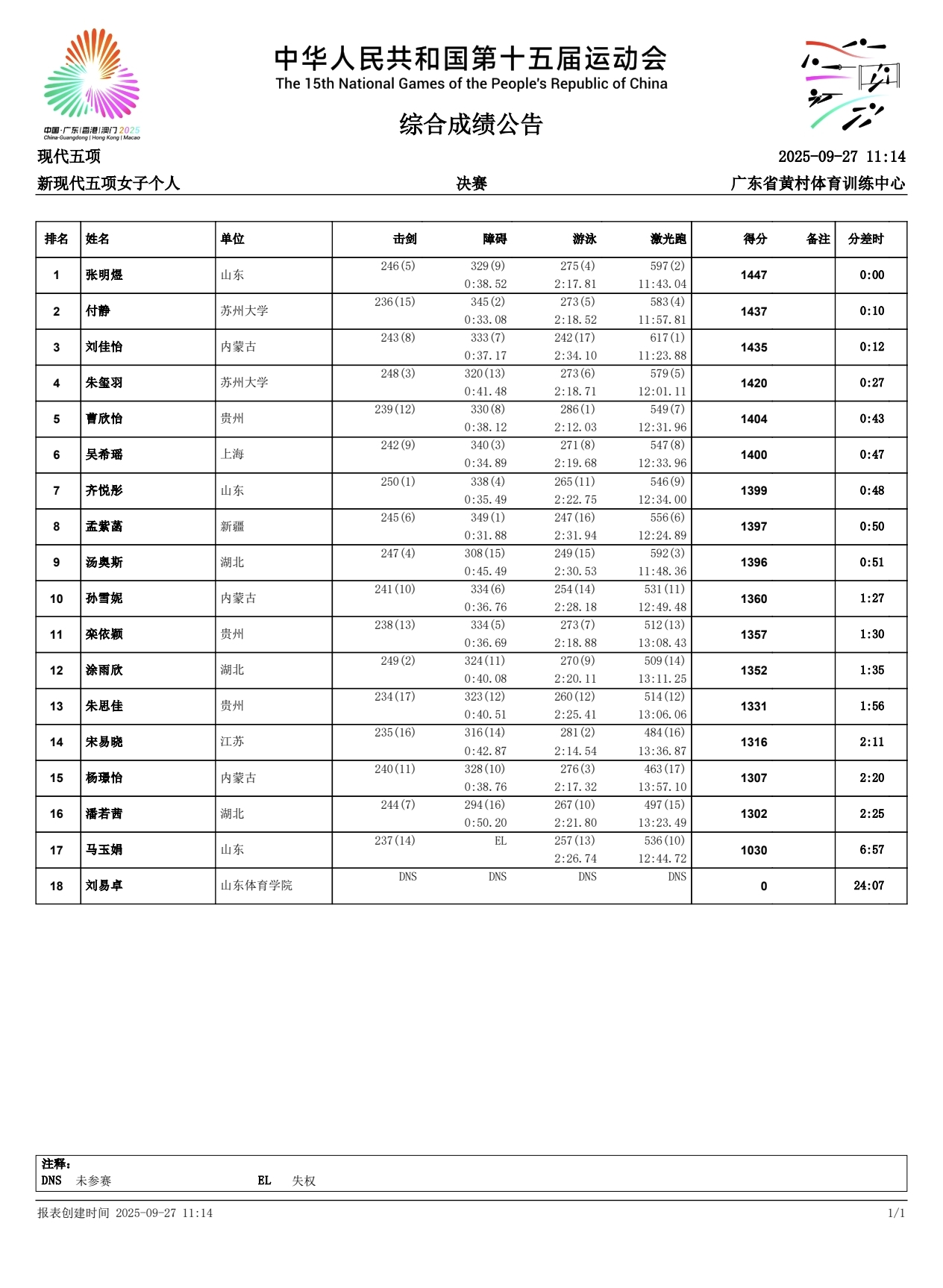 【赛事成绩】第十五届全国运动会现代五项成绩公告(9月27日)