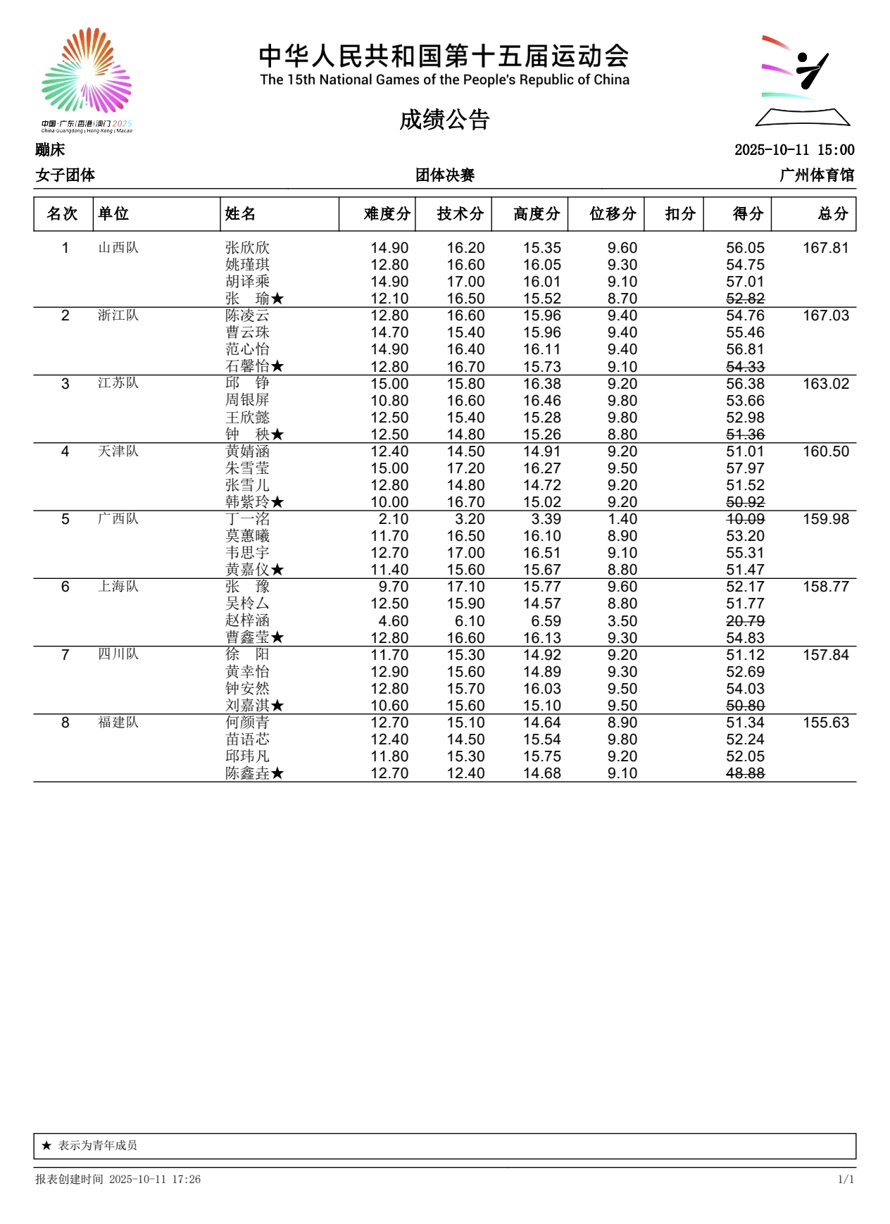 【赛事成绩】第十五届全国运动会蹦床女子团体决赛成绩公告(10月11日)