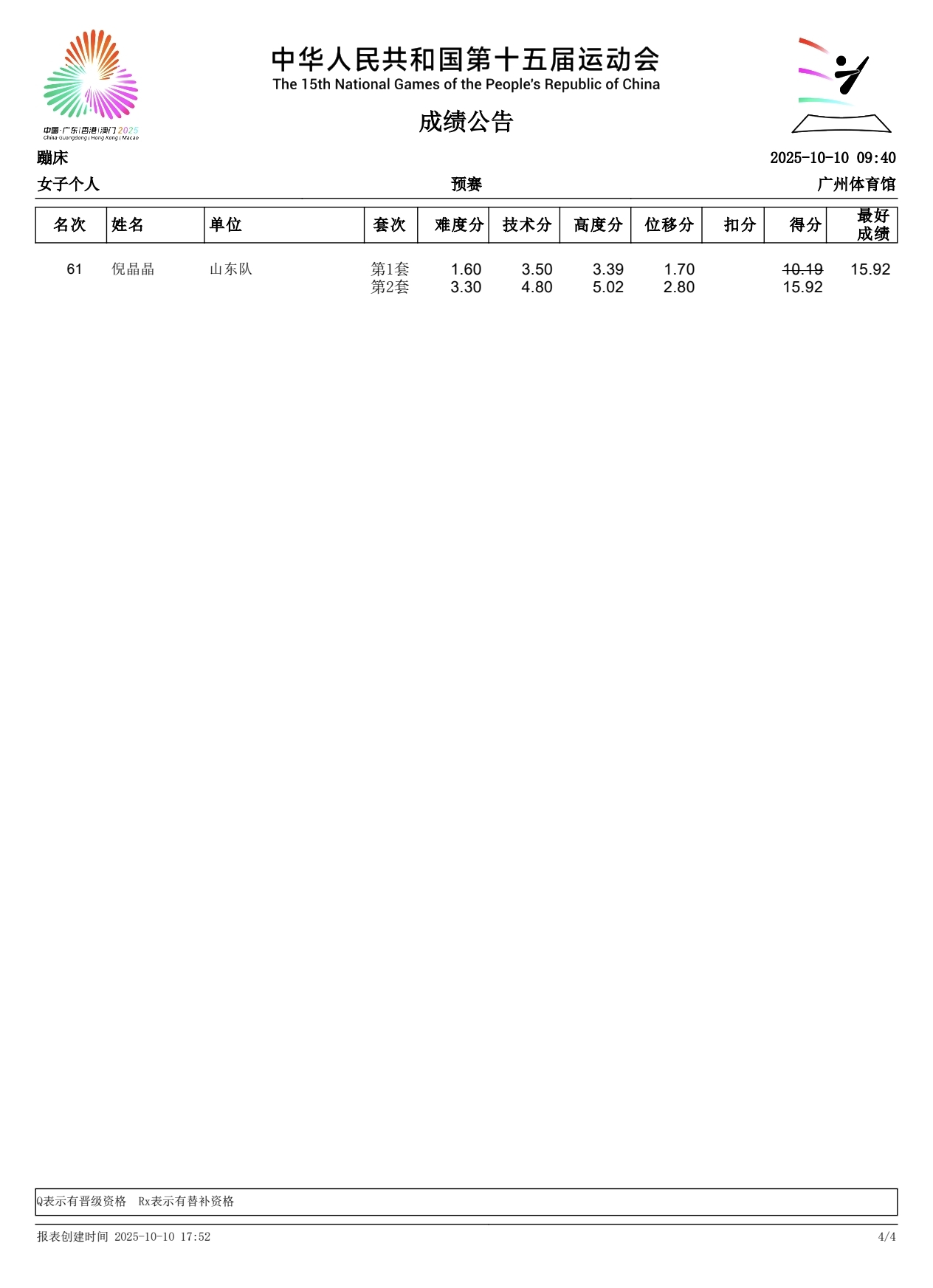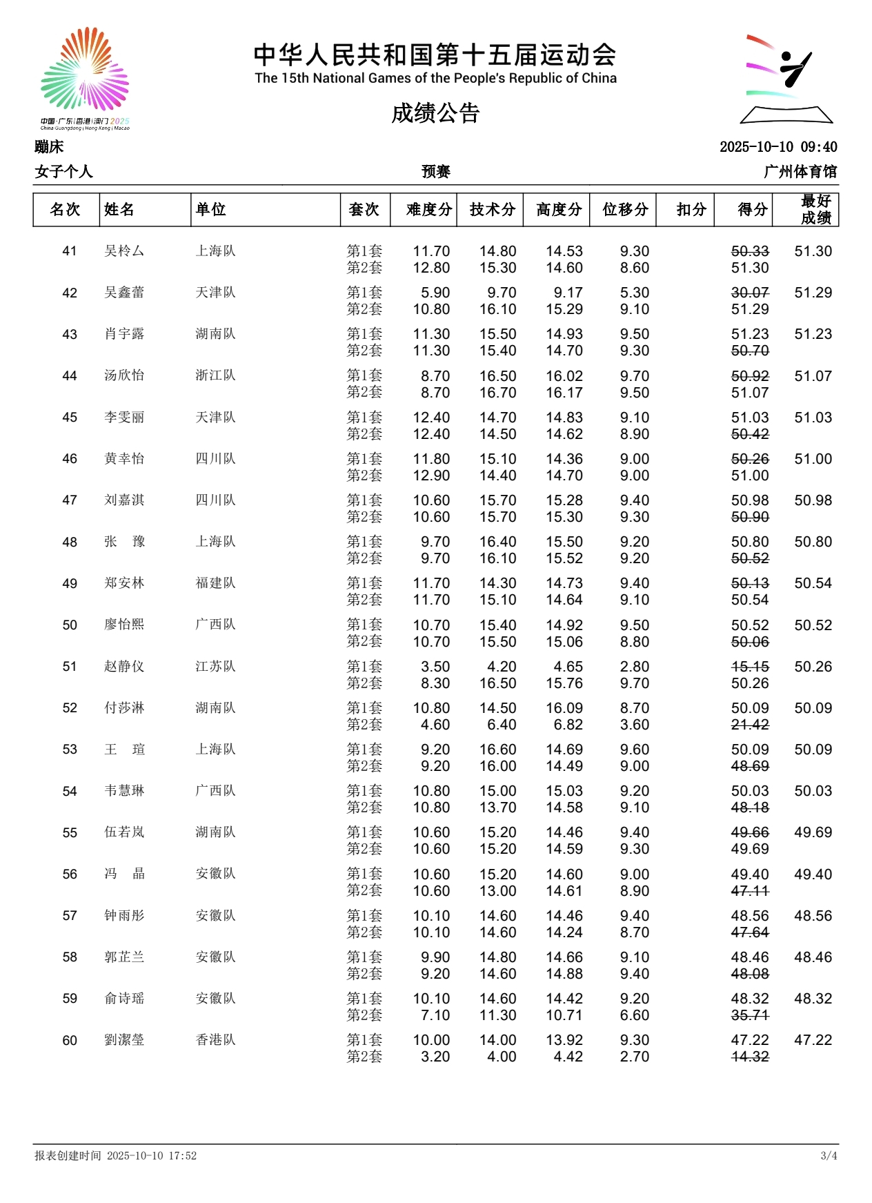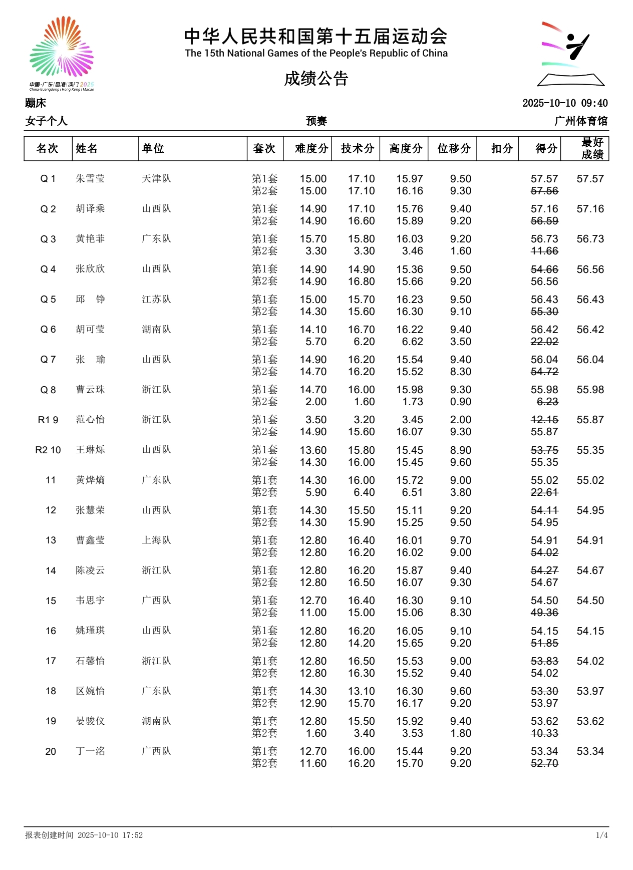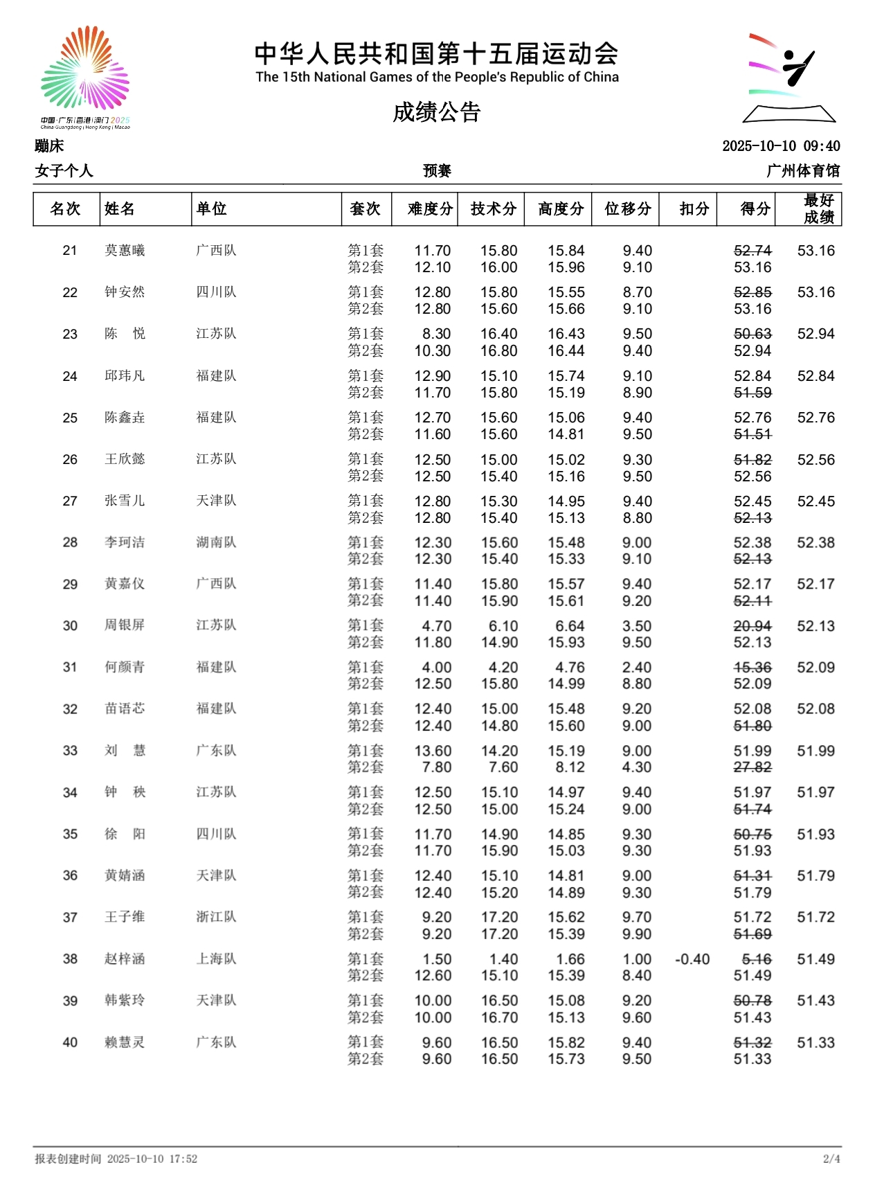 【赛事成绩】第十五届全国运动会蹦床女子个人预赛成绩公告(10月10日)