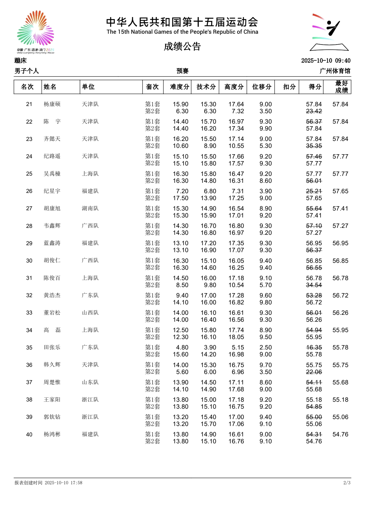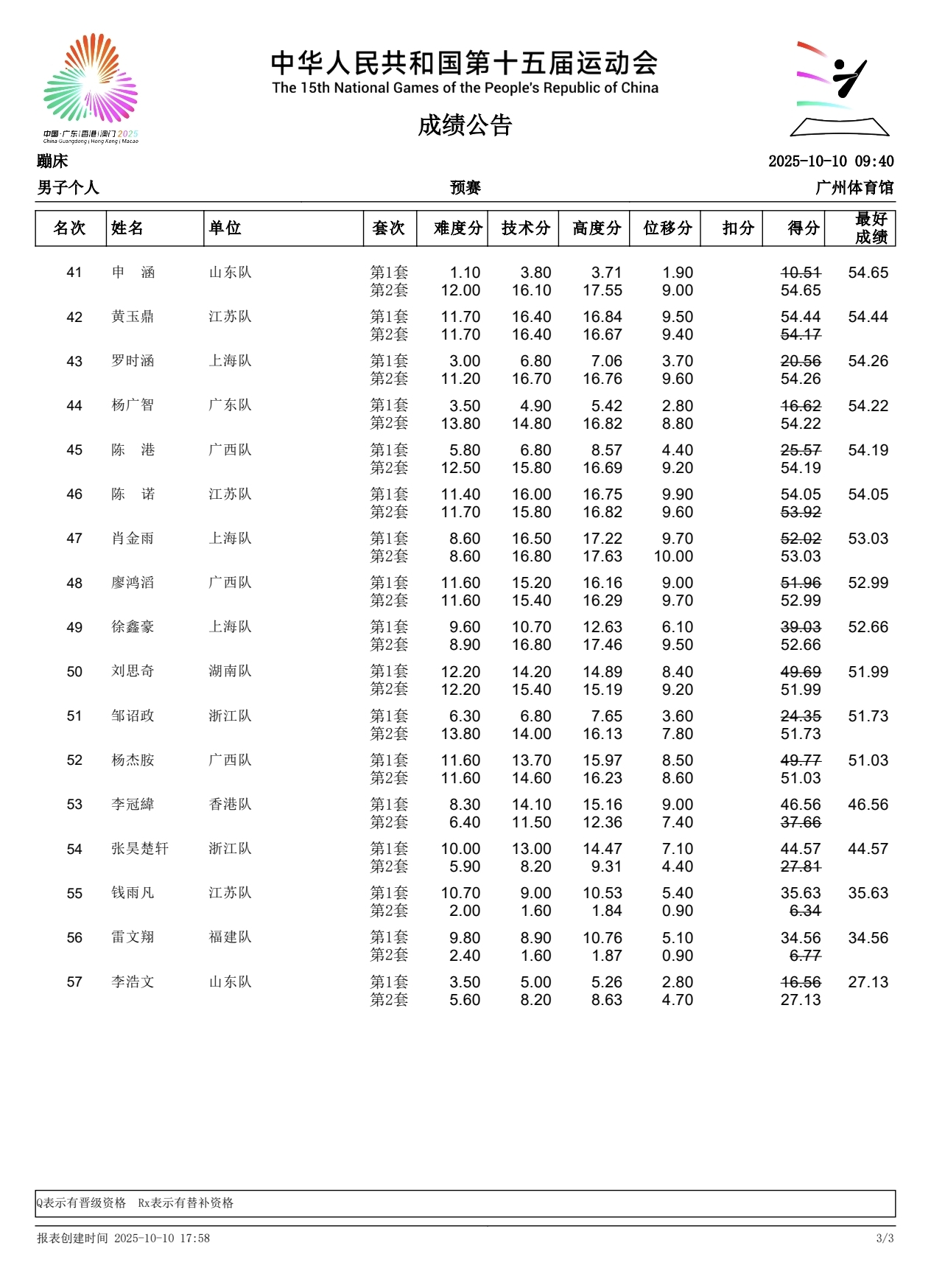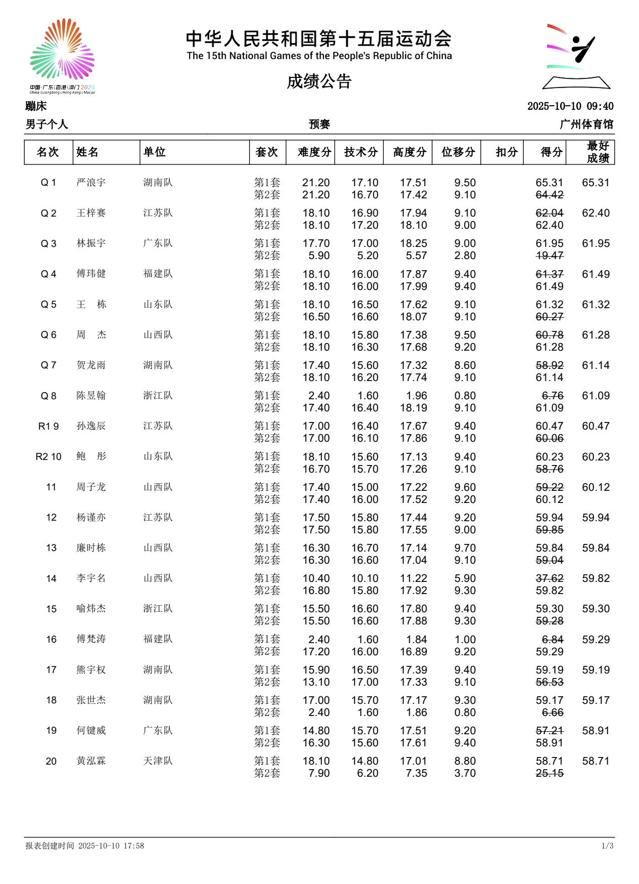 【赛事成绩】第十五届全国运动会蹦床男子个人预赛成绩公告(10月10日)