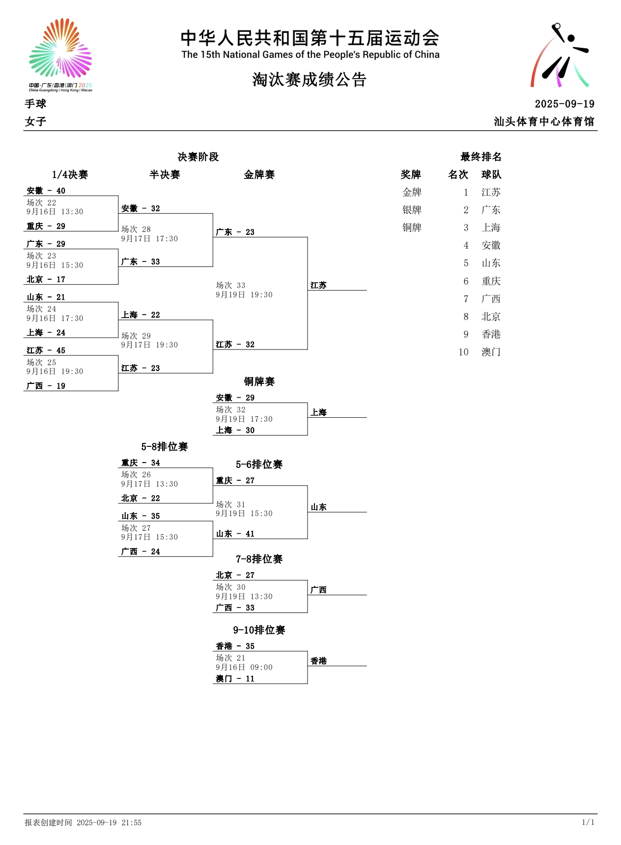 第十五届全国运动会女子手球淘汰赛成绩公告(9月19日)