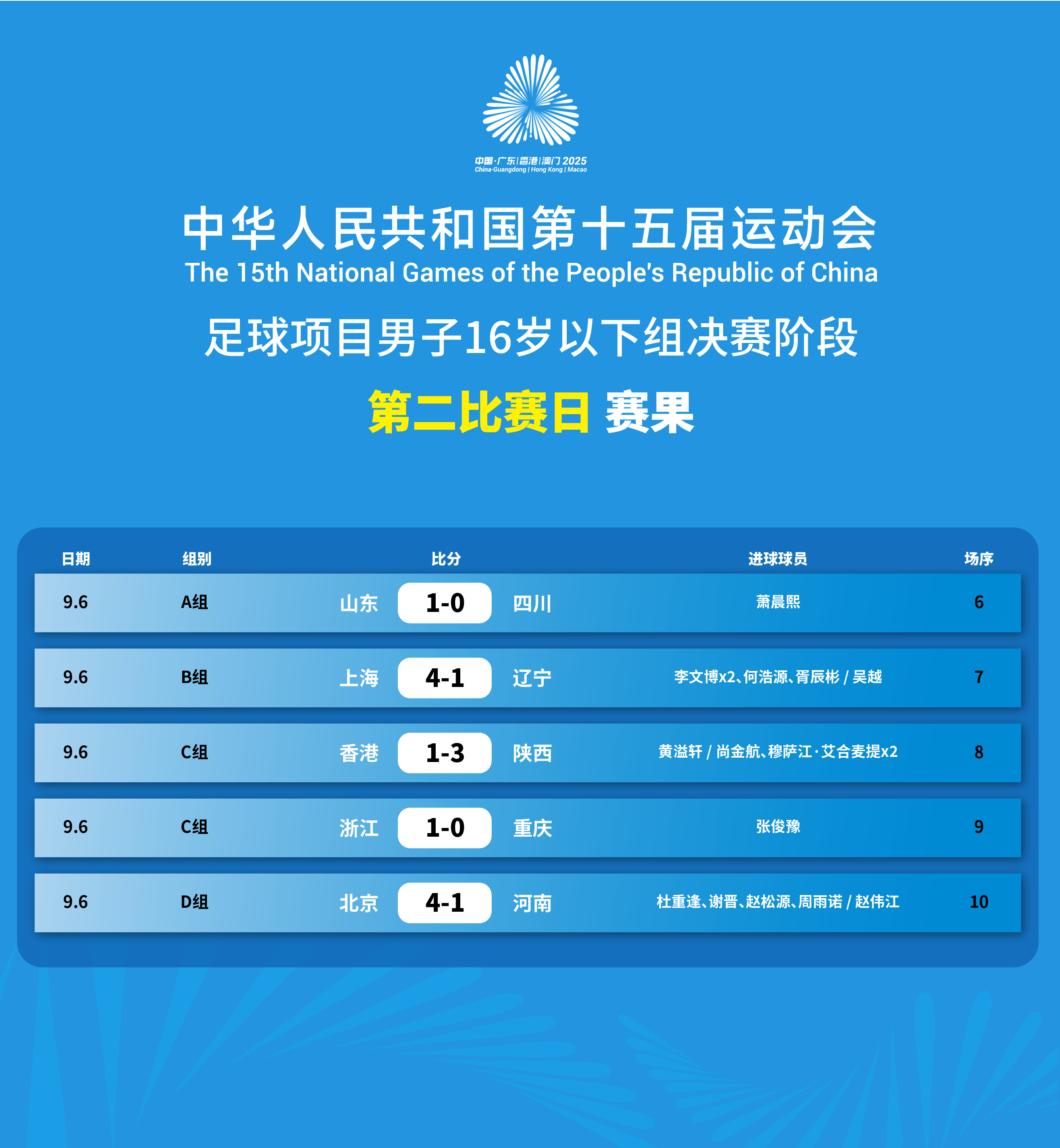 【赛事成绩】第十五届全国运动会男足16岁以下组(第二比赛日赛果)