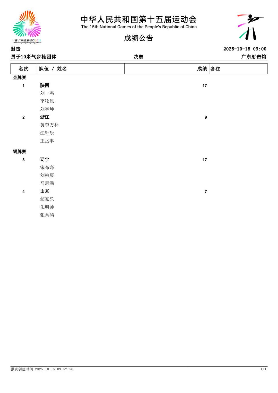 【赛事成绩】第十五届全国运动会射击男子10米气步枪团体决赛成绩公告(10月15日)