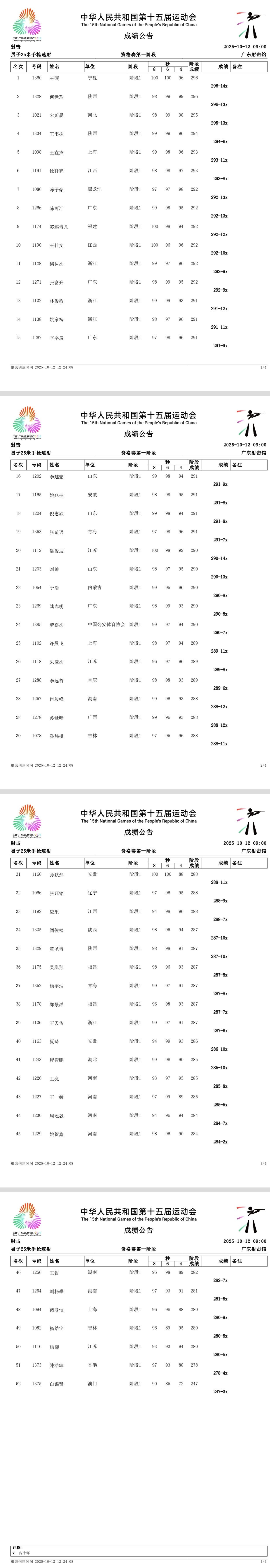 【赛事成绩】第十五届全国运动会射击男子25米手枪速射资格赛第一阶段成绩公告(10月12日)