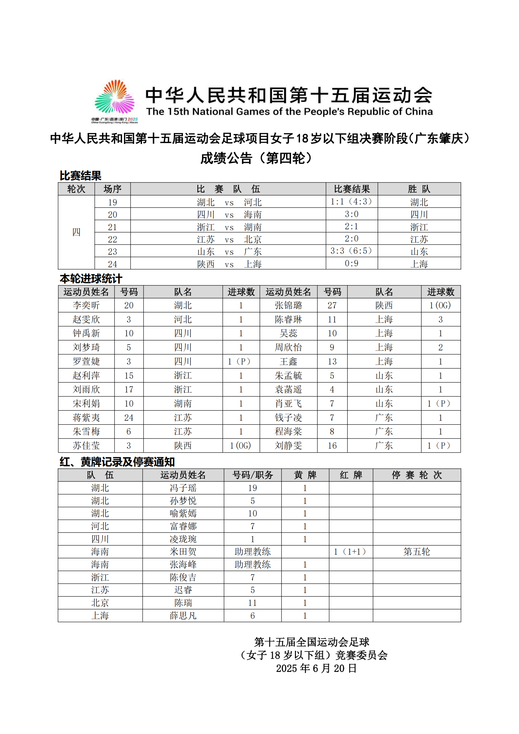 全运会女足U18决赛阶段成绩公告(第四轮)
