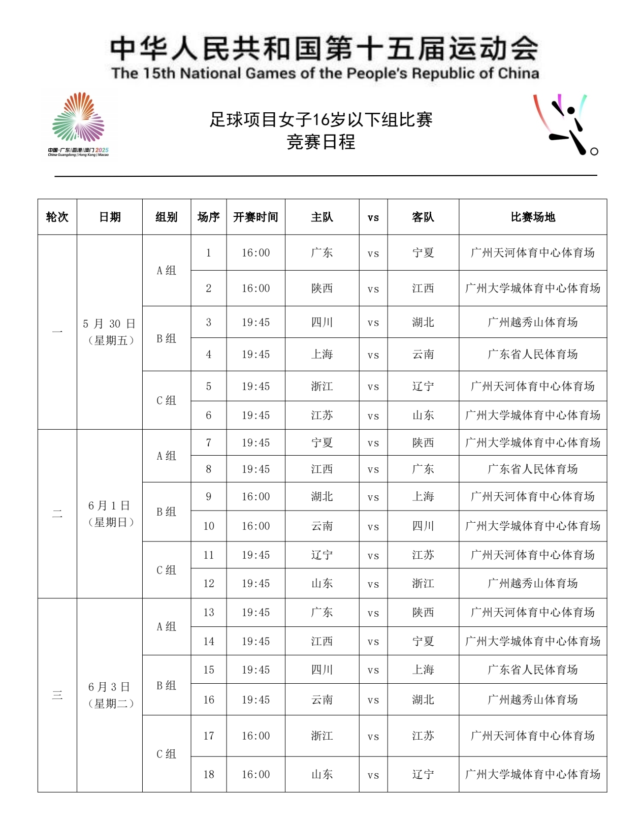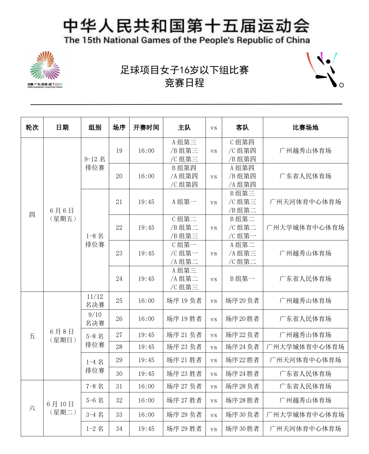 【竞赛日程】十五运会女足U16决赛阶段竞赛日程