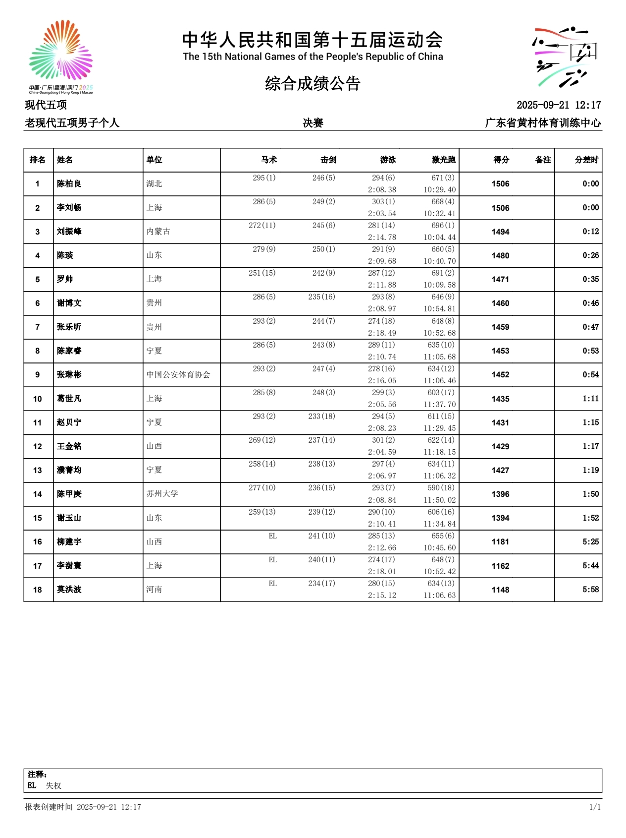 【赛事成绩】第十五届全国运动会现代五项-老现代五项男子个人综合成绩公告(9月21日)