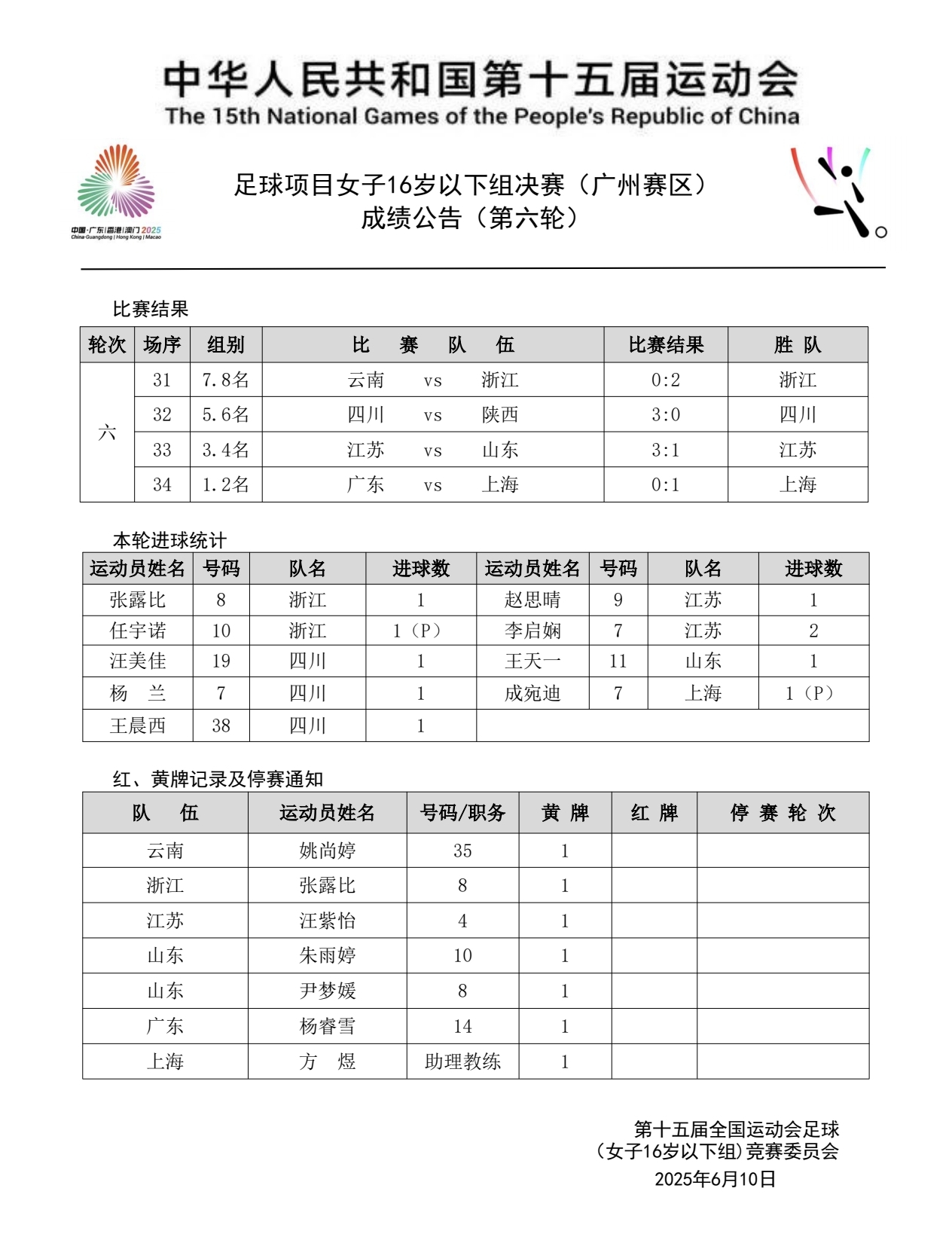 全运会女足U16决赛阶段成绩公告(第六轮)
