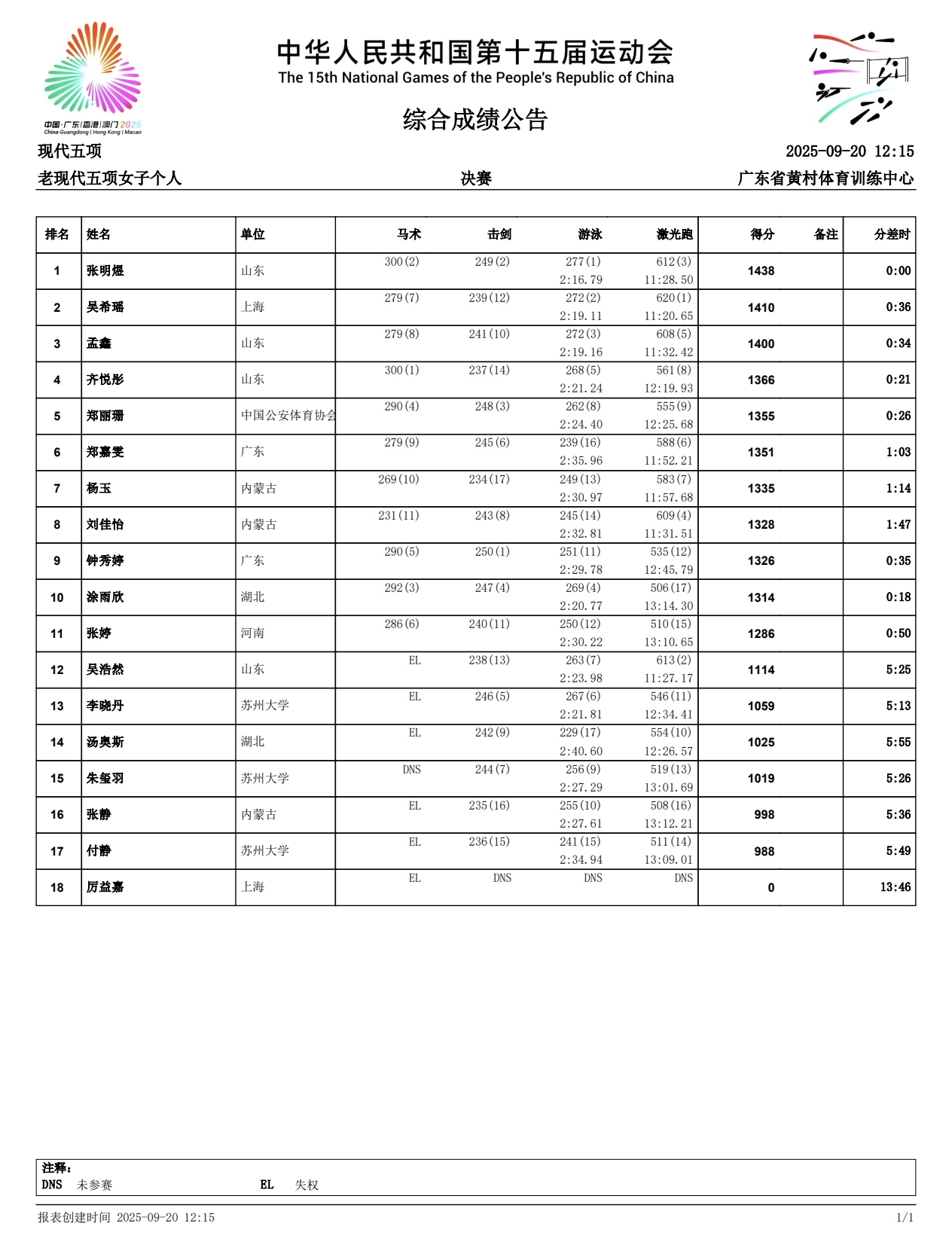 【赛事成绩】第十五届全国运动会现代五项-老现代五项女子个人综合成绩公告(9月20日)