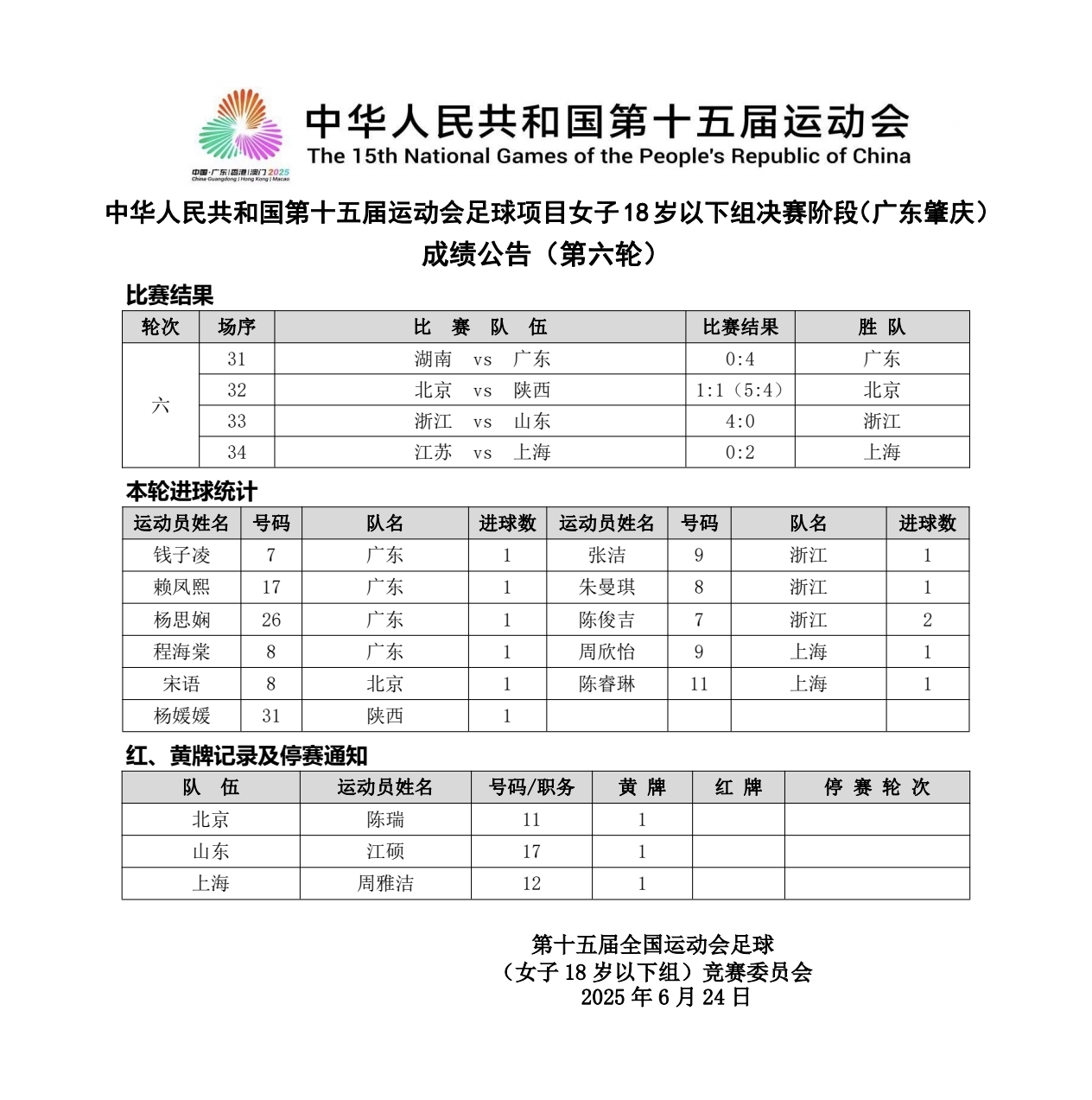 全运会女足U18决赛阶段成绩公告(第六轮)
