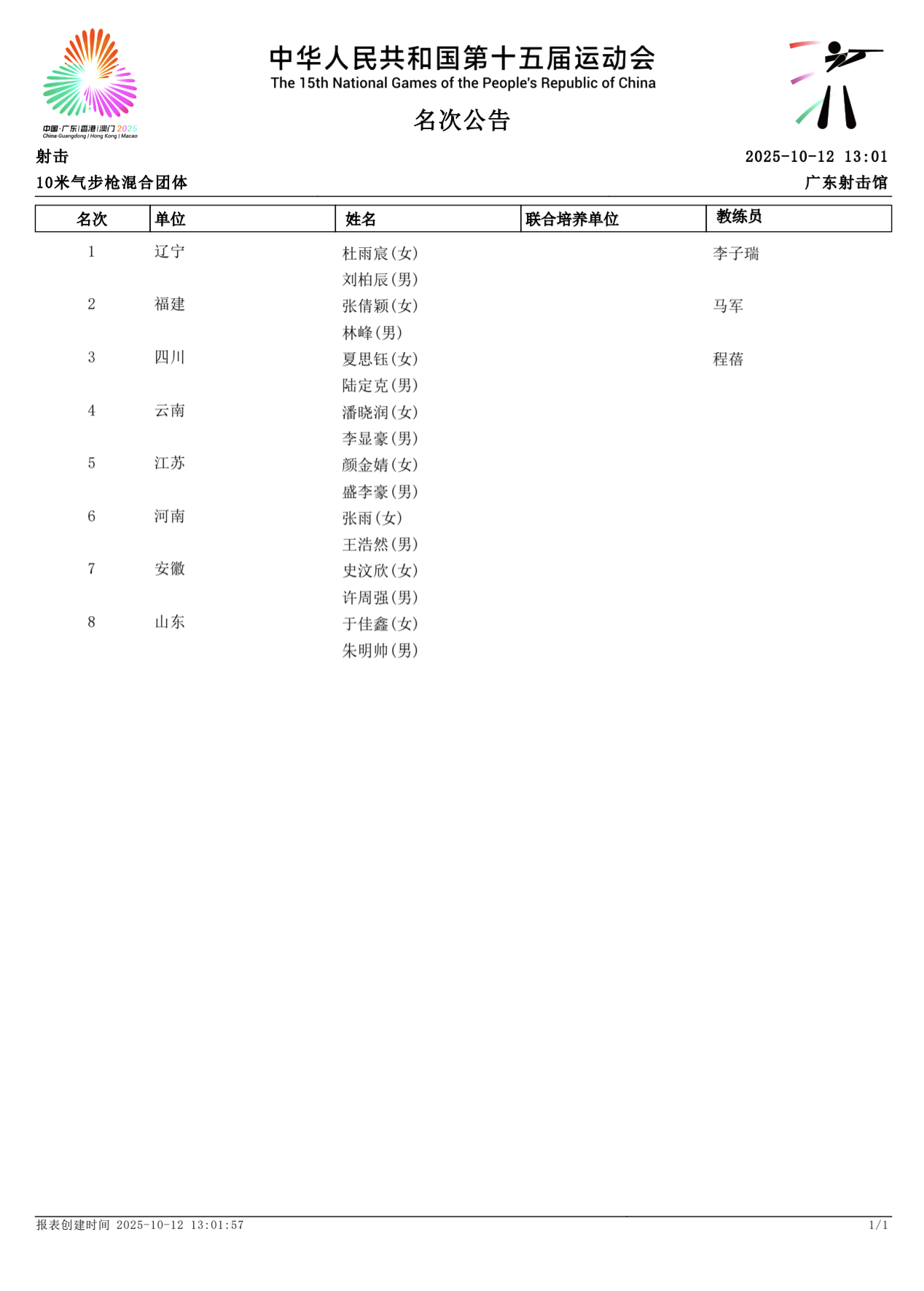 【赛事成绩】第十五届全国运动会射击10米气步枪混合团体名次公告(10月12日)