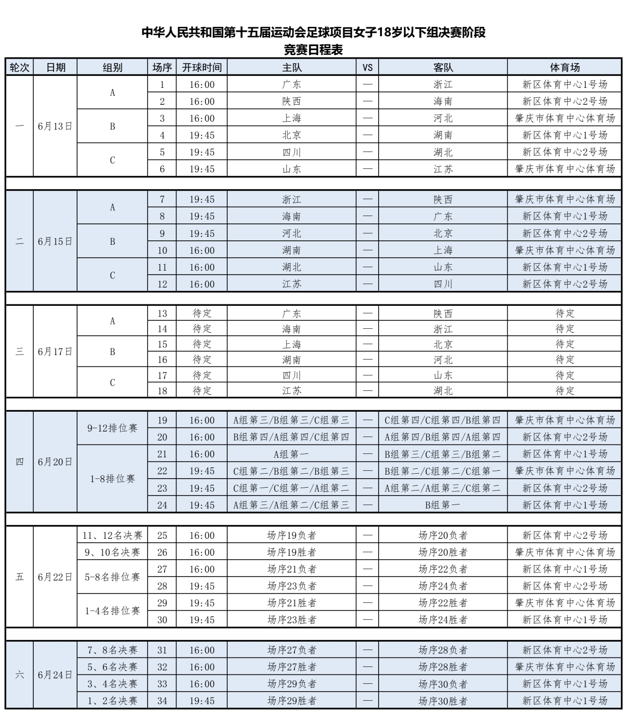 十五运会足球项目女子18岁以下组决赛阶段竞赛日程表