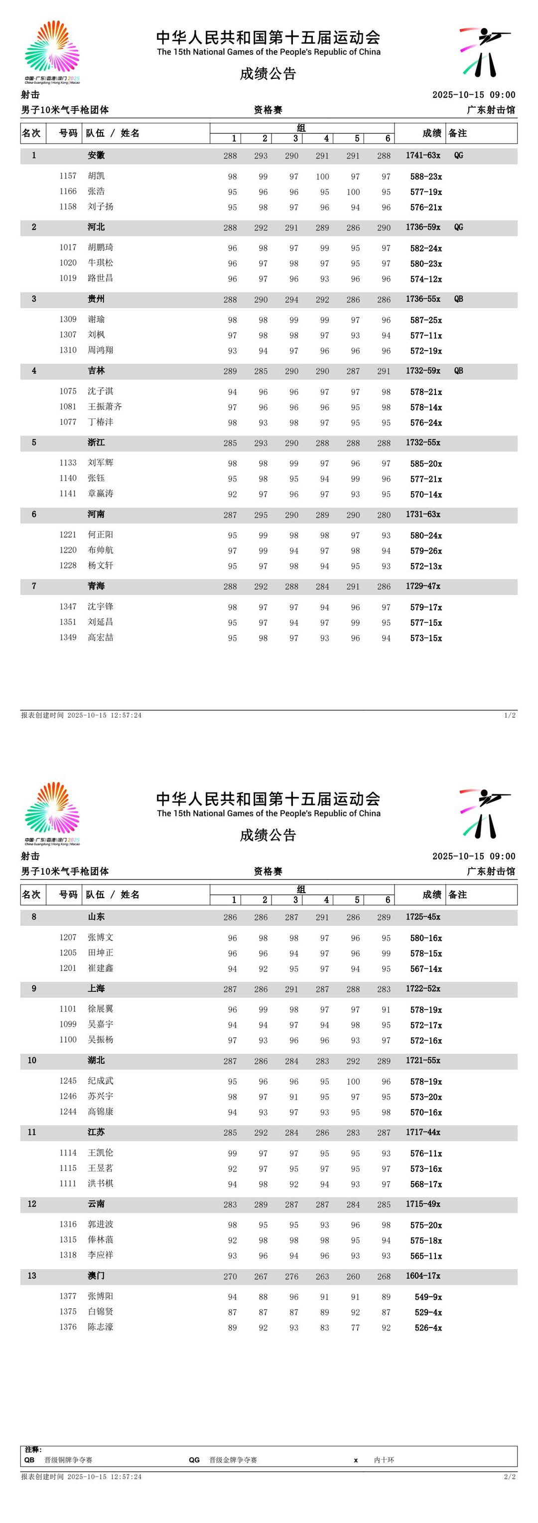 【赛事成绩】第十五届全国运动会射击男子10米气手枪团体资格赛成绩公告(10月15日)