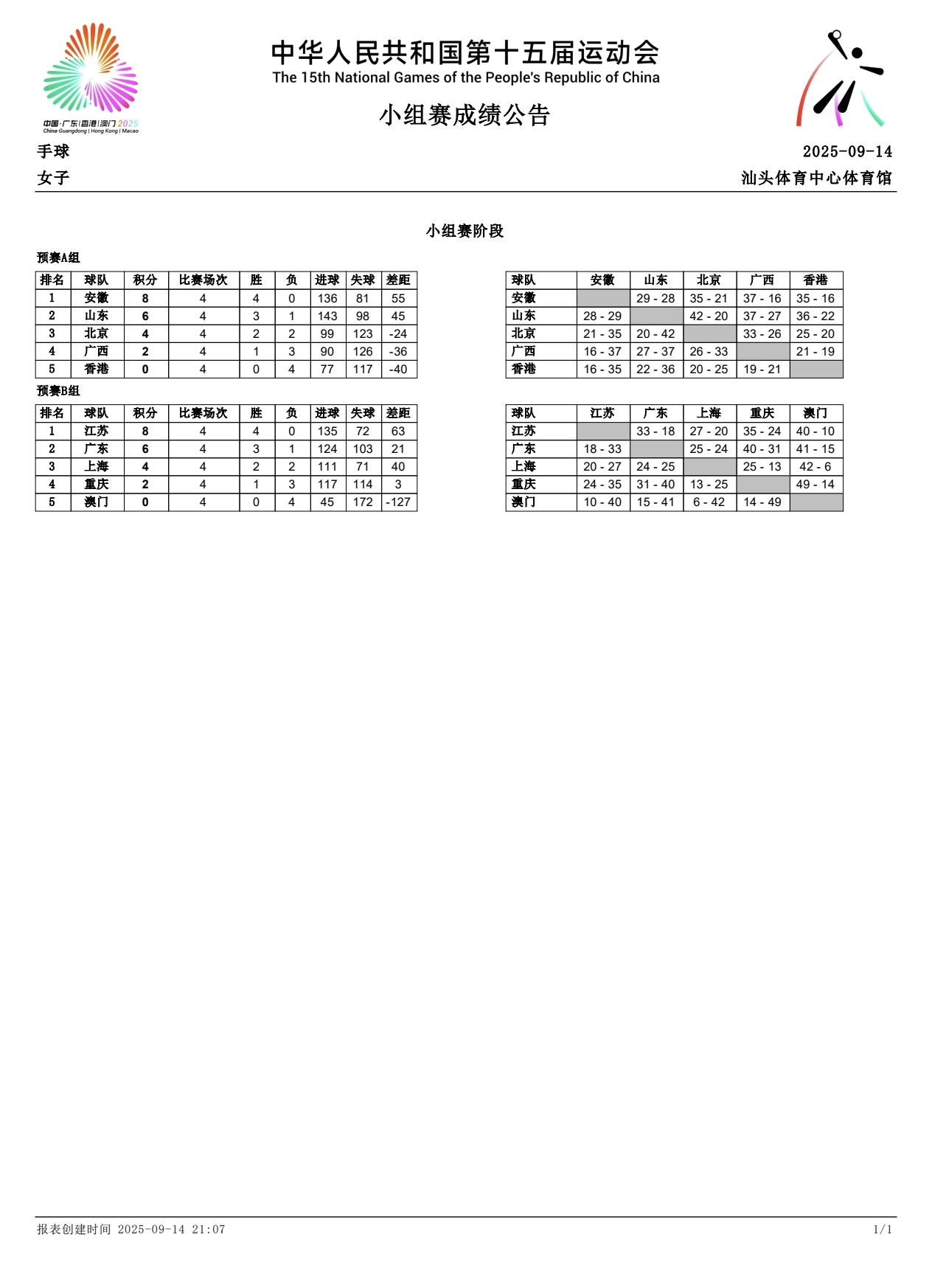 第十五届全国运动会女子手球小组赛(9月14日成绩公告)