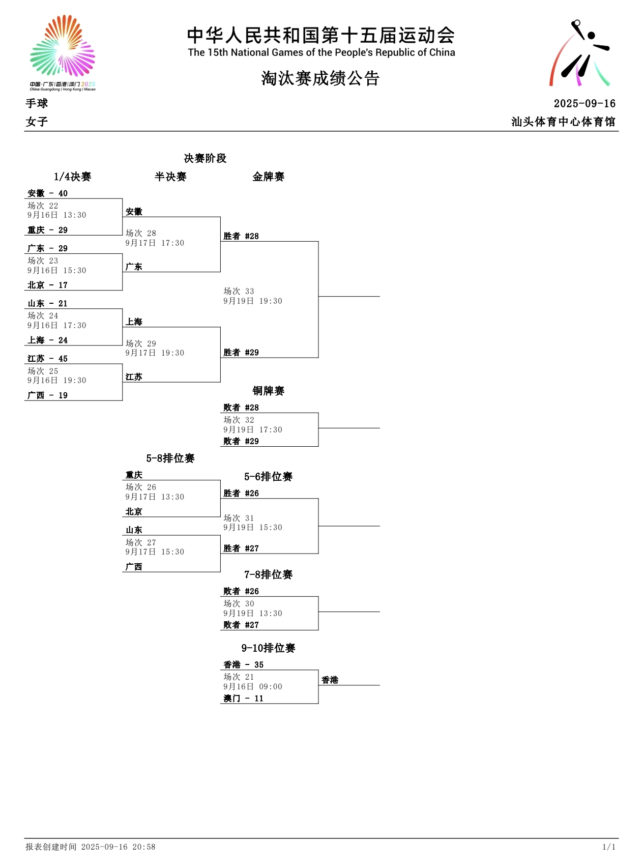 【赛事成绩】第十五届全国运动会女子手球淘汰赛成绩公告(9月16日)