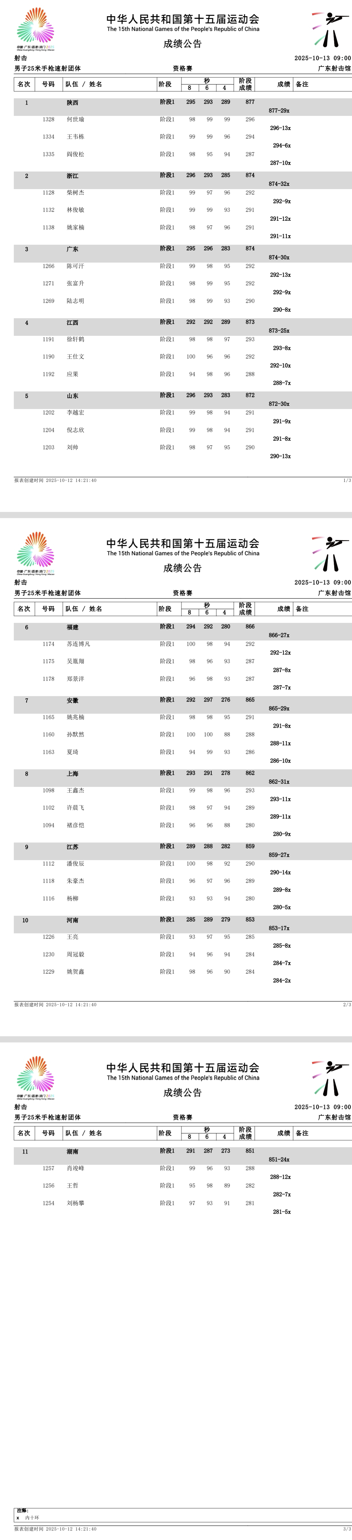 【赛事成绩】第十五届全国运动会射击男子25米手枪速射团体资格赛成绩公告(10月12日)