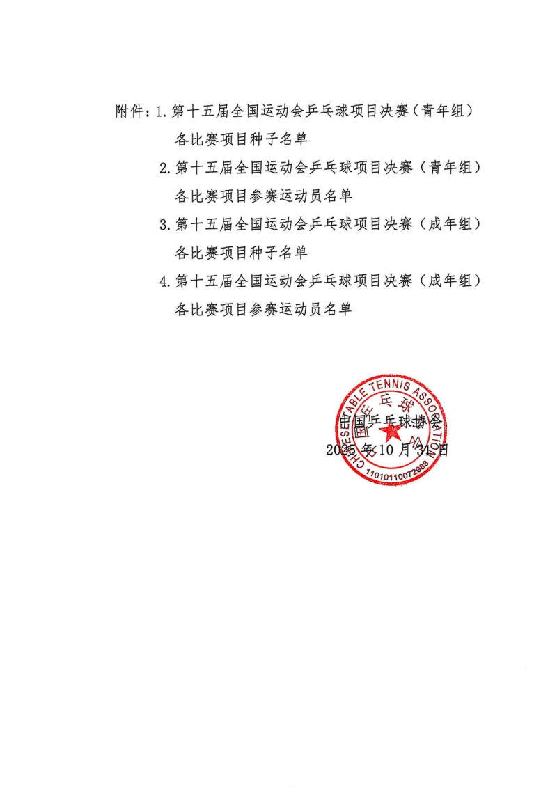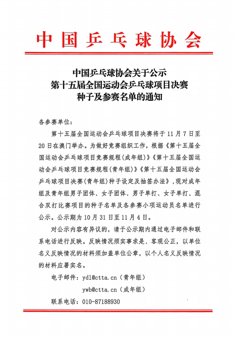 中国乒乓球协会关于公示第十五届全国运动会乒乓球项目决赛种子及参赛名单的通知