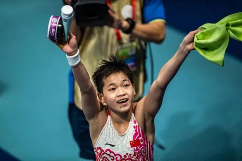 2021年9月12日,广东队选手全红婵在比赛后向观众微笑致意,她以419.25分的总成绩获得冠军。当日,十四运会跳水女子10米台决赛在西安举行。新华社记者 陶亮 摄