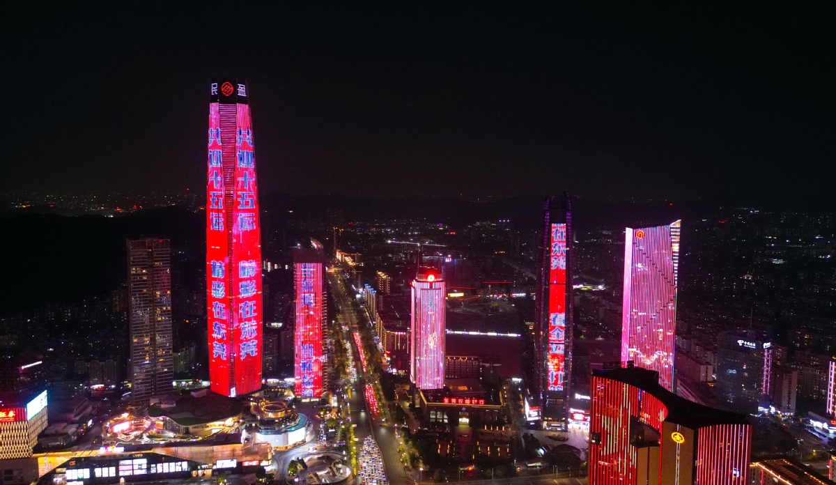 4月23日晚,在十五运会开幕倒计时200天之际,东莞民盈·国贸、环球经贸中心等城市地标同步点亮夜空。“激情全运会 活力大湾区”“十五运 看篮球 进莞来”等醒目标语闪耀全城,吸引市民驻足拍摄。