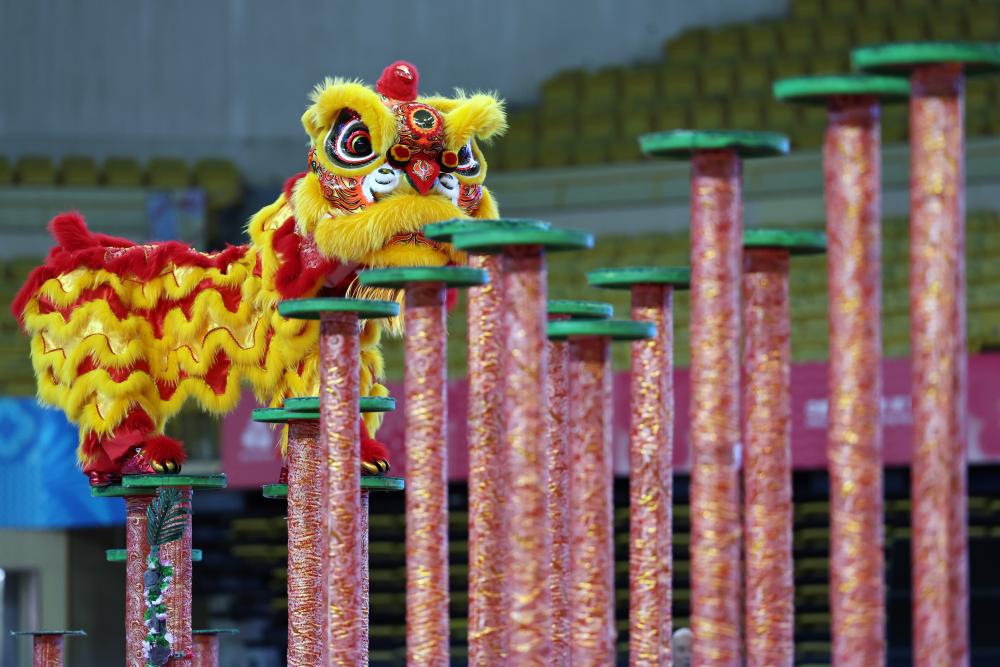 2025年11月11日,粤港澳队在第十五届全运会群众展演舞龙舞狮项目南狮自选决赛比赛中。王鹏 摄